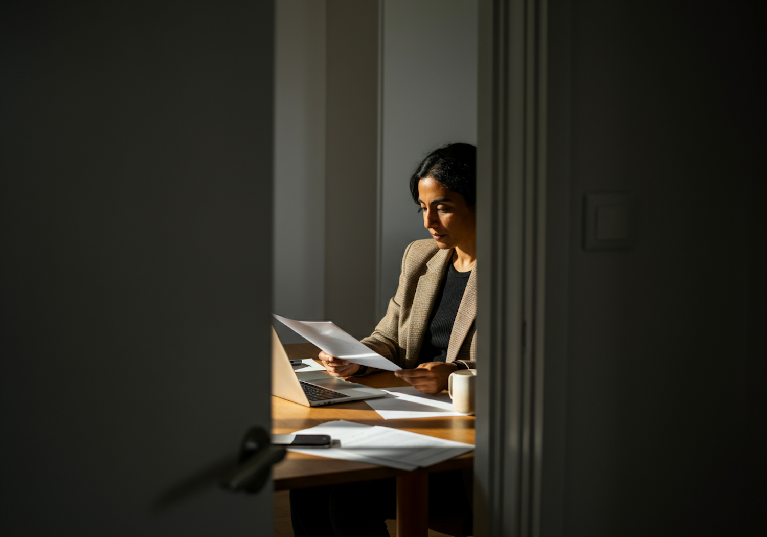 A woman in a beige blazer works at a desk with papers and a laptop, viewed through a partially open door in a dimly lit room.