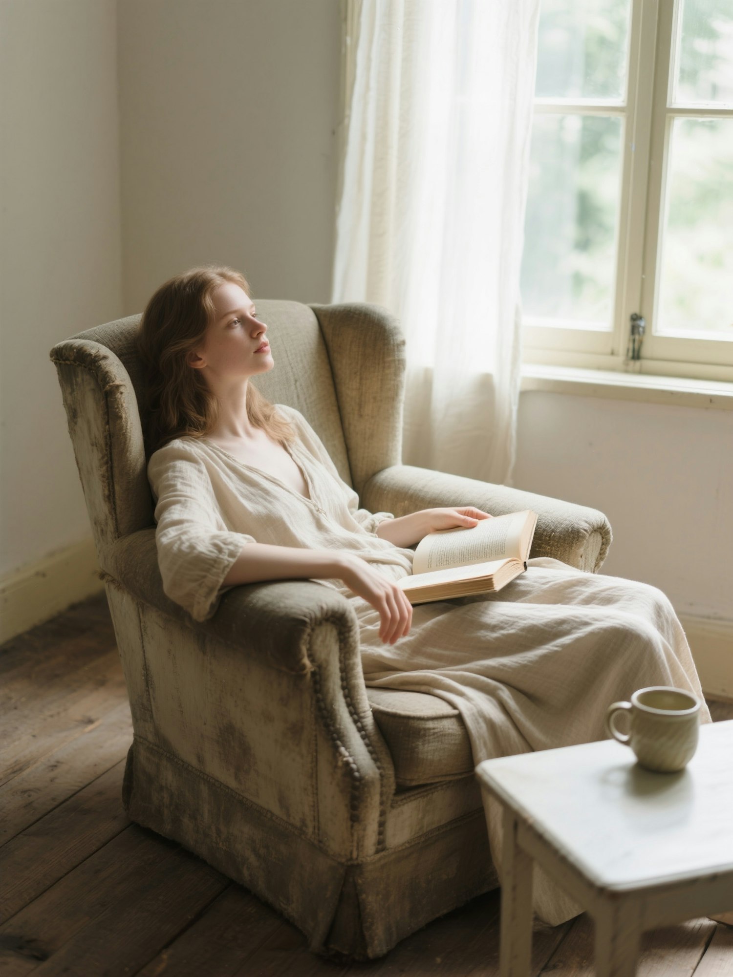 Soft natural light, muted faded colors, desaturated tones, light and airy palette, visible film grain, rustic minimalism — young woman reclining in an old armchair by a sunlit window, wearing loose neutral-toned clothing, one arm resting on the armrest, the other holding a book half open