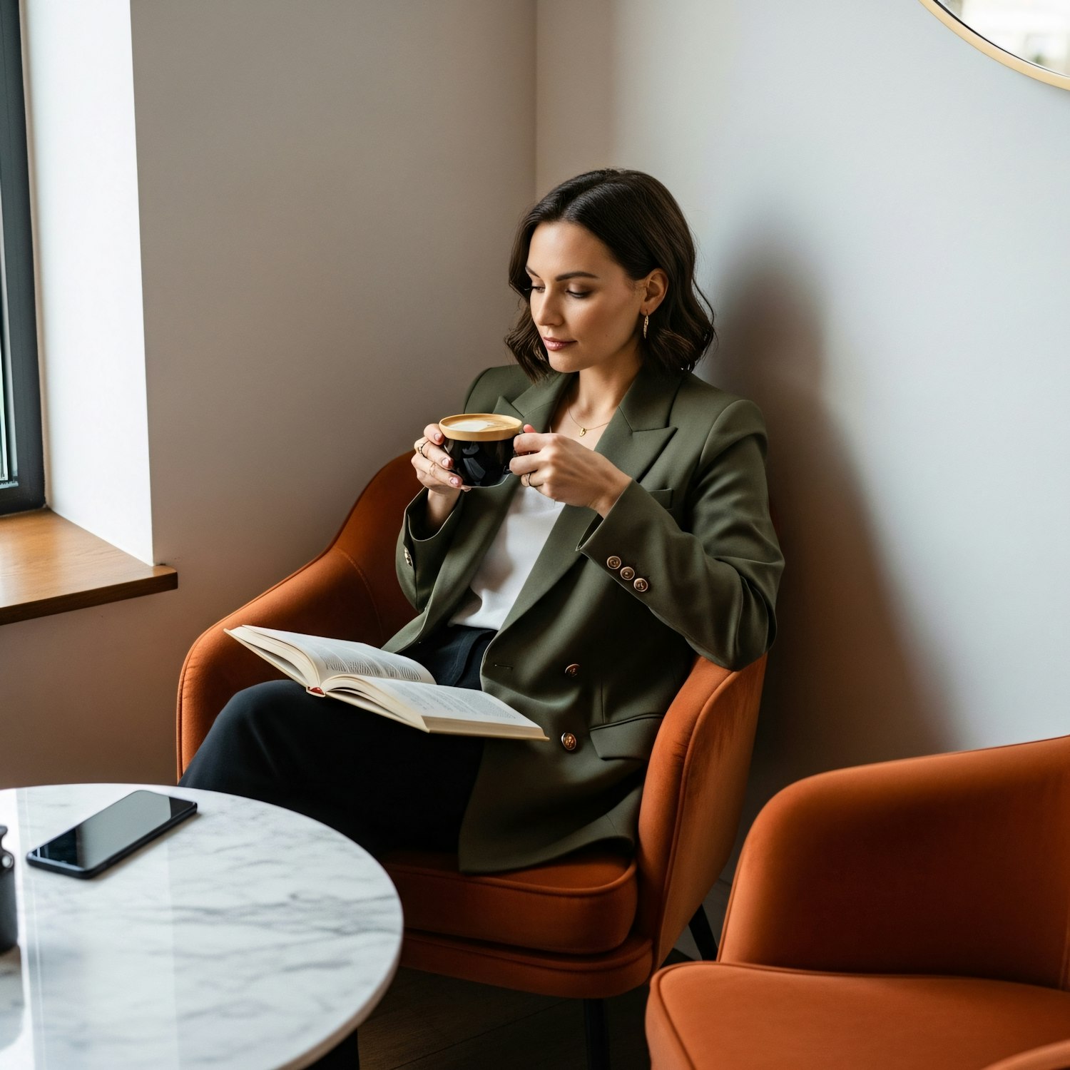 Woman in a green blazer enjoys coffee and a book in a cozy, modern setting with orange chairs and a marble table.