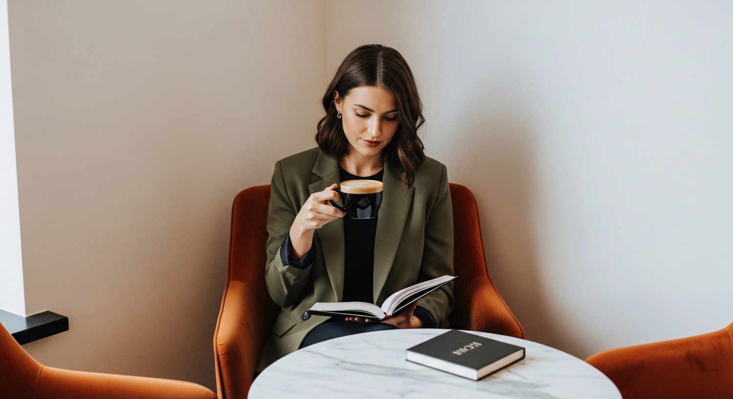 A woman in a green blazer enjoys coffee and a book at a marble table, creating a cozy and modern atmosphere.