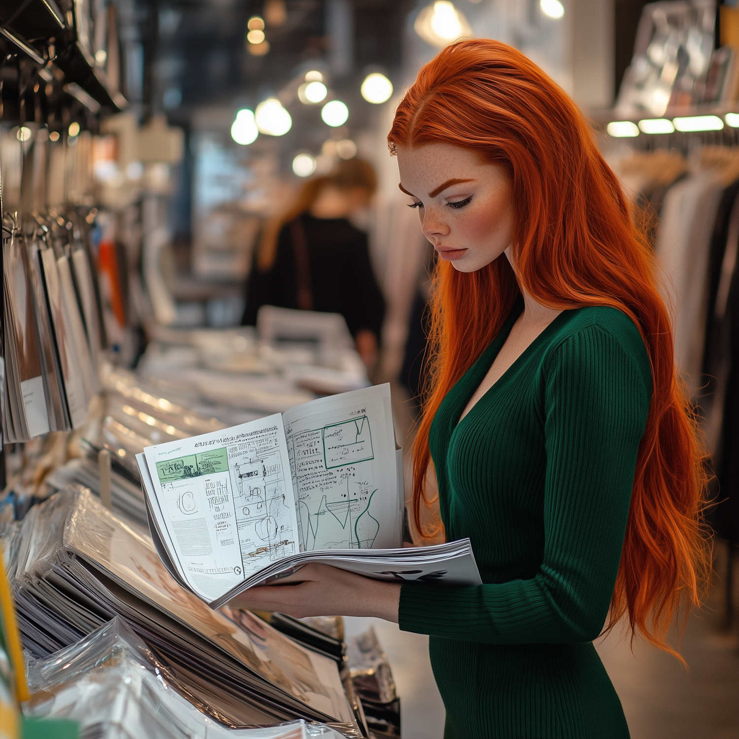 Young woman with red hair in a green dress reads a book in a store aisle, surrounded by clothes and shoppers.