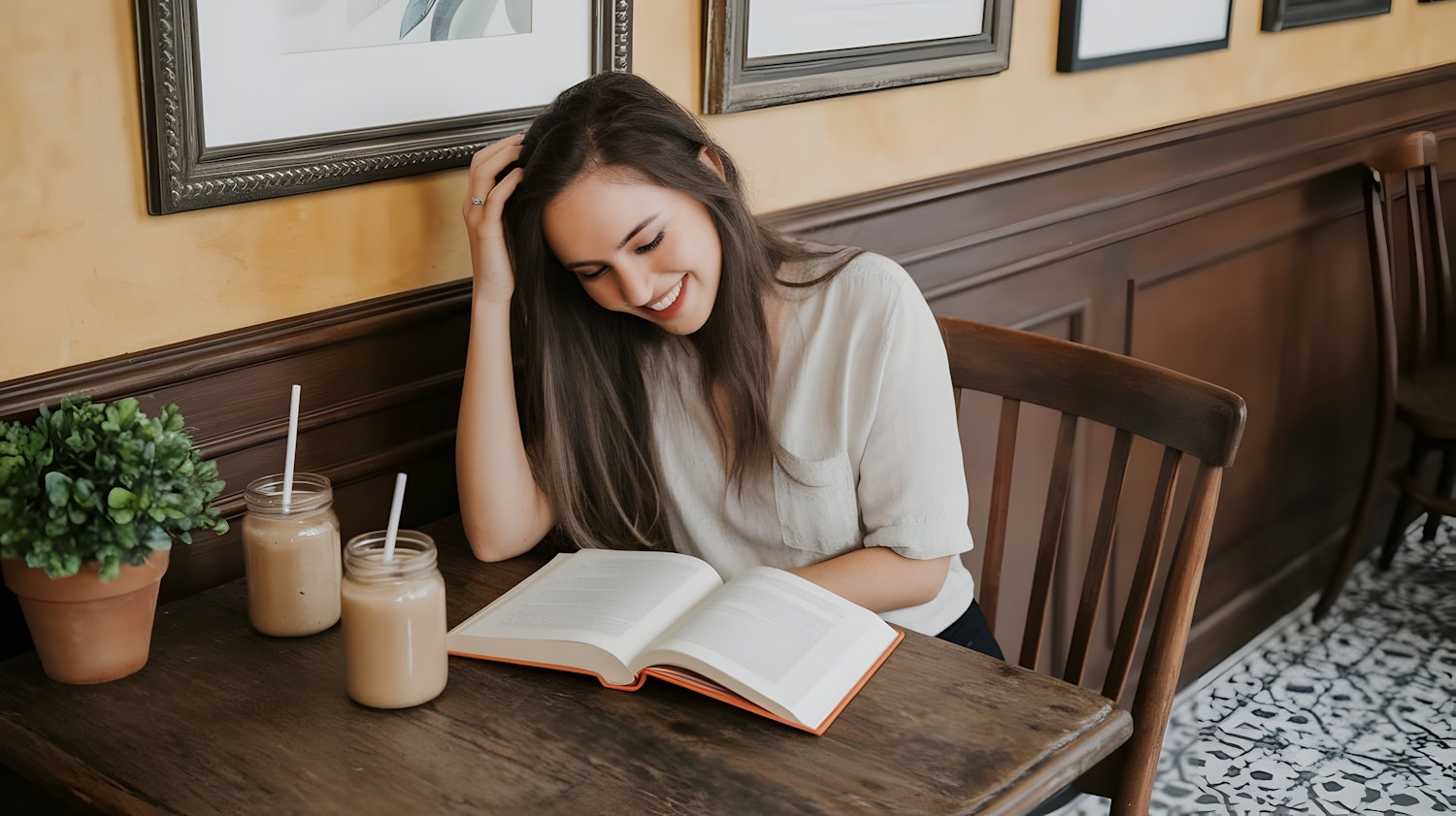 A woman reading a book in a cozy café, with iced coffee and a potted plant on the table, surrounded by warm decor.