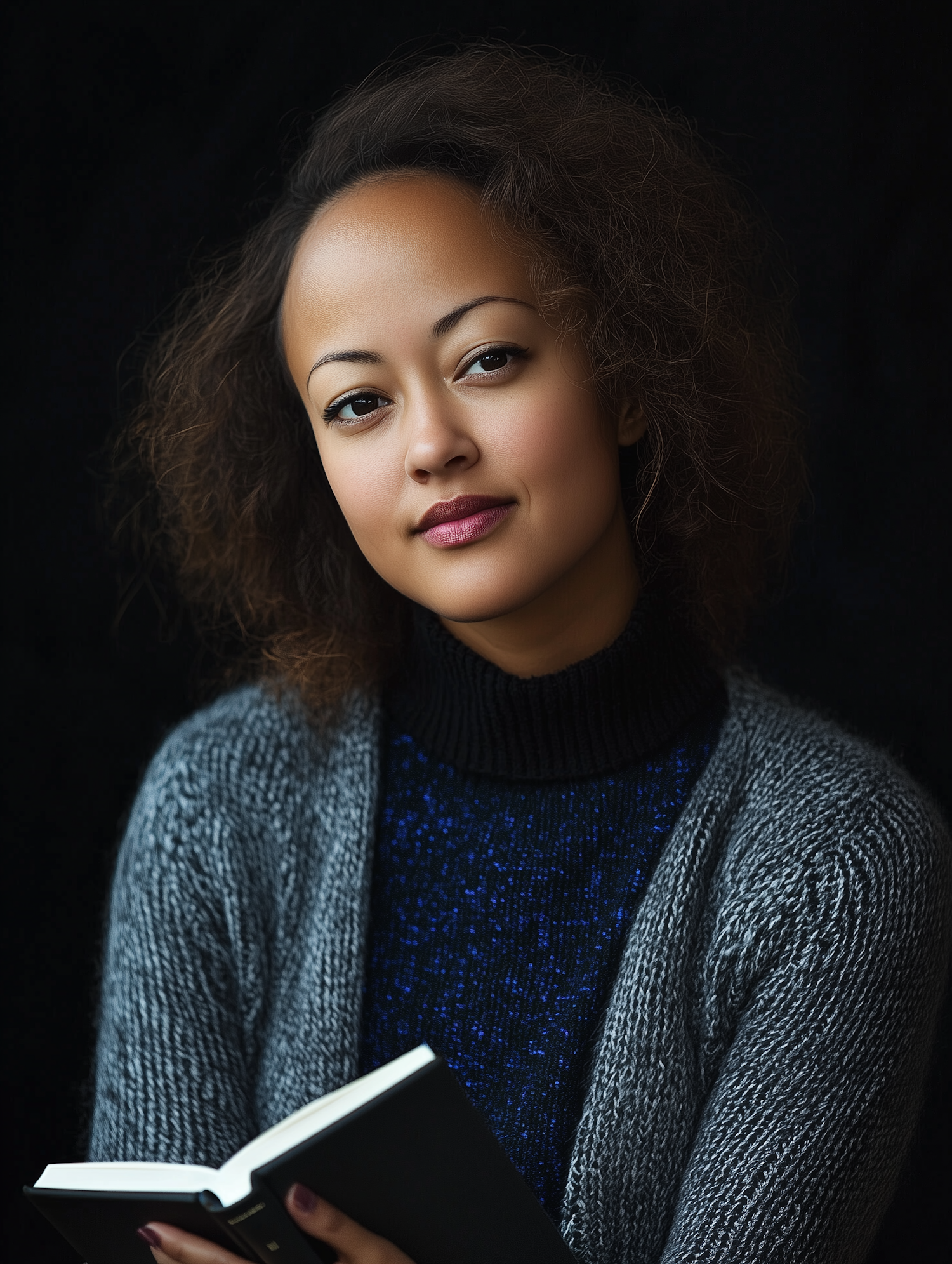 Woman with curly hair and a gentle smile holding a book, wearing a blue sweater and gray cardigan against a dark background.