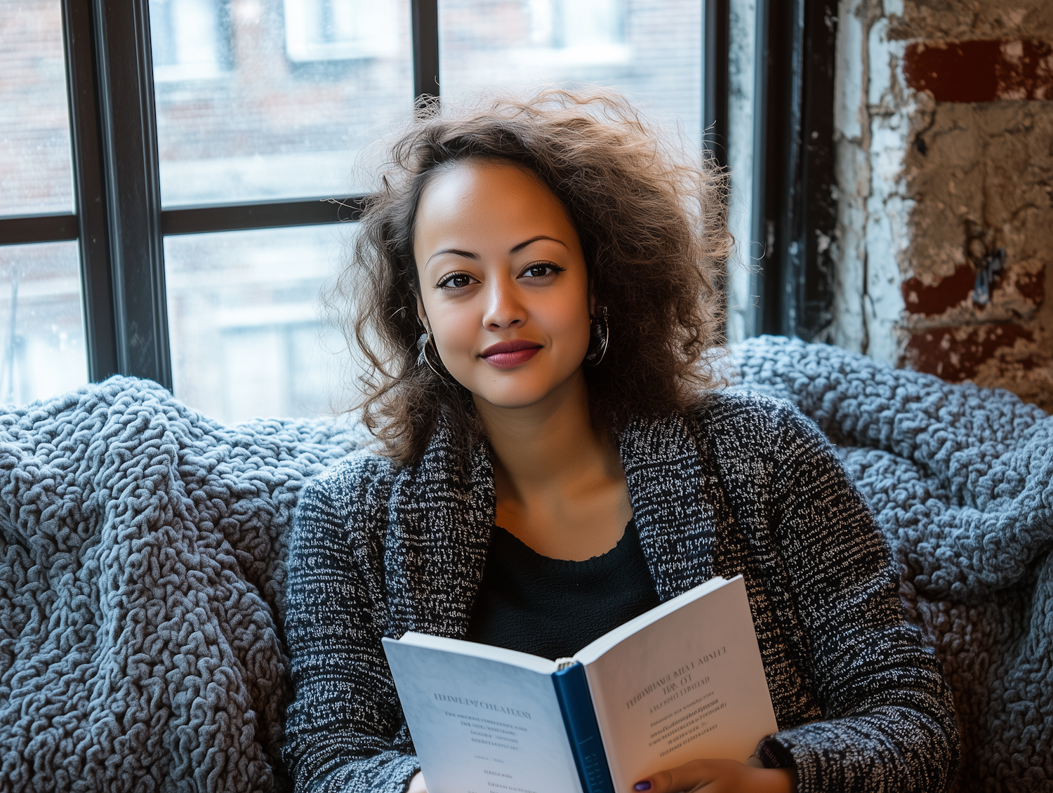 Woman with curly hair reading a book by a window, wrapped in a cozy knit blanket, exuding a calm and relaxed vibe.