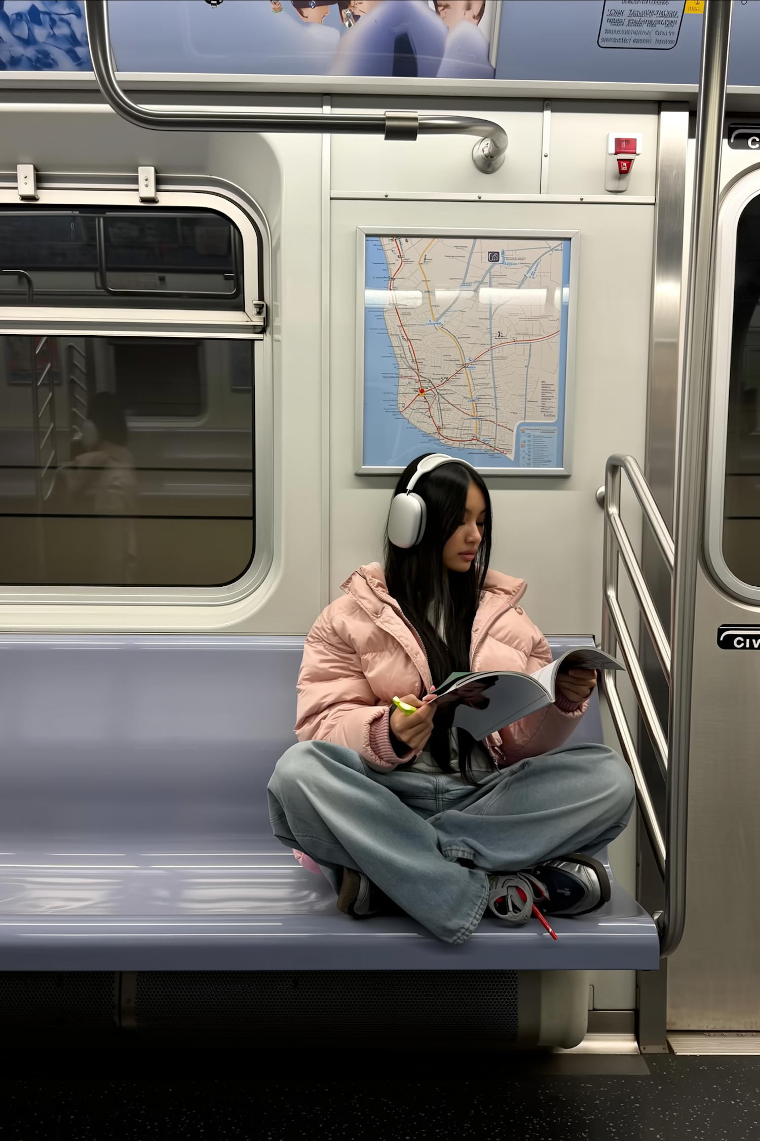 A young woman in a pink jacket and headphones reads a book on a subway, highlighting text. The scene is calm and modern.