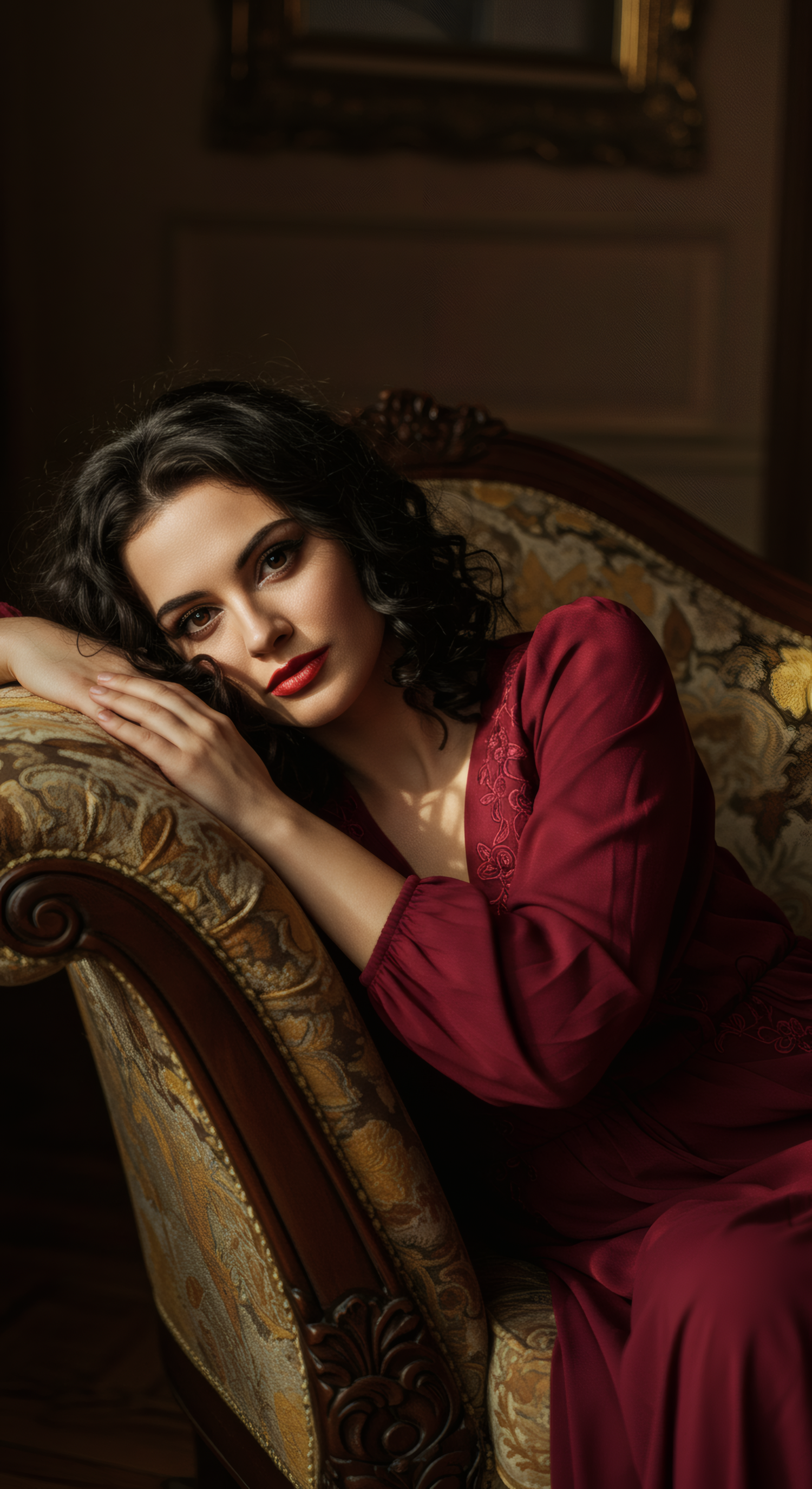 Elegant woman in a red dress reclines on a vintage armchair, exuding grace and sophistication in soft, warm lighting.