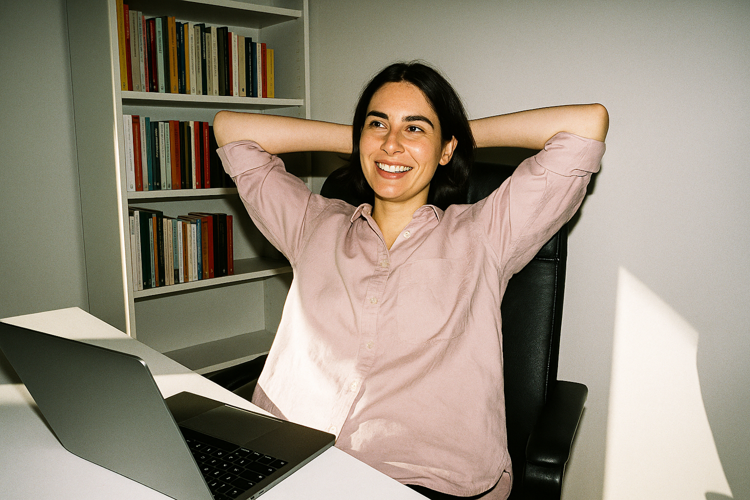 A woman smiling while relaxing at her desk with a laptop, set against a bookshelf background. Bright and cheerful workspace vibes.
