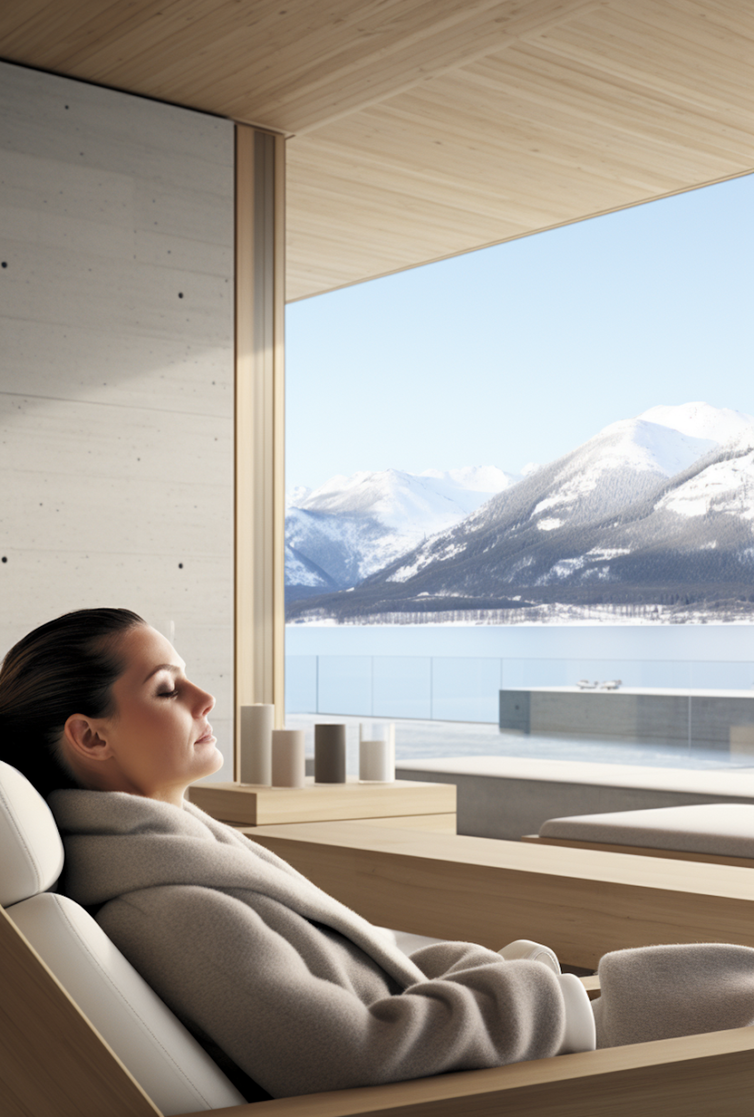Woman relaxing in a minimalist room with mountain view, wearing a gray coat. Modern design with wood and concrete elements.