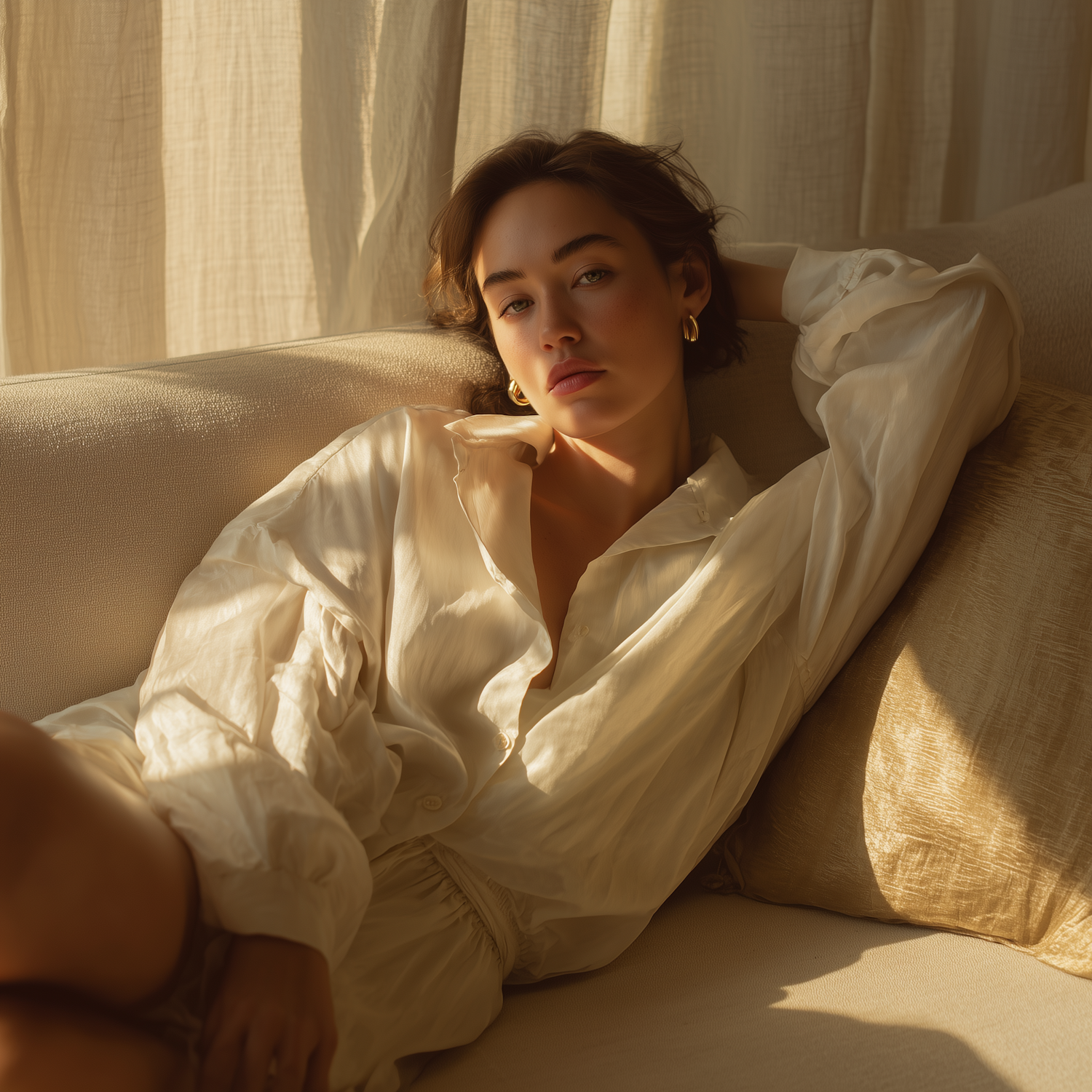 A woman in a cream blouse relaxes on a beige sofa, bathed in warm sunlight filtering through sheer curtains.