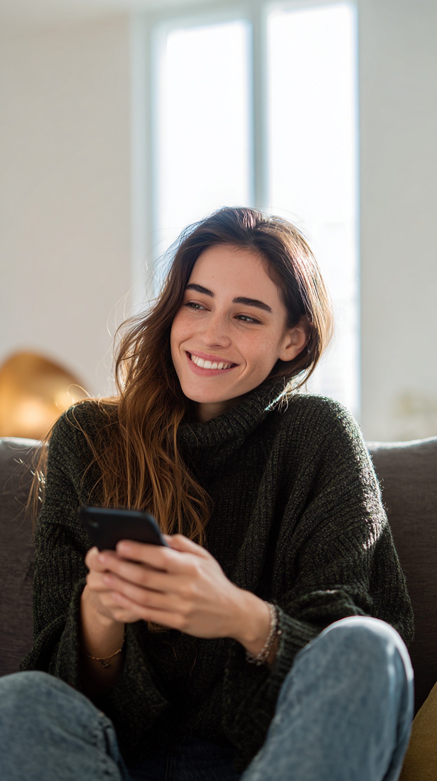 A cheerful woman in a cozy sweater smiles while holding her phone, sitting in a sunlit room with a relaxed and warm atmosphere.