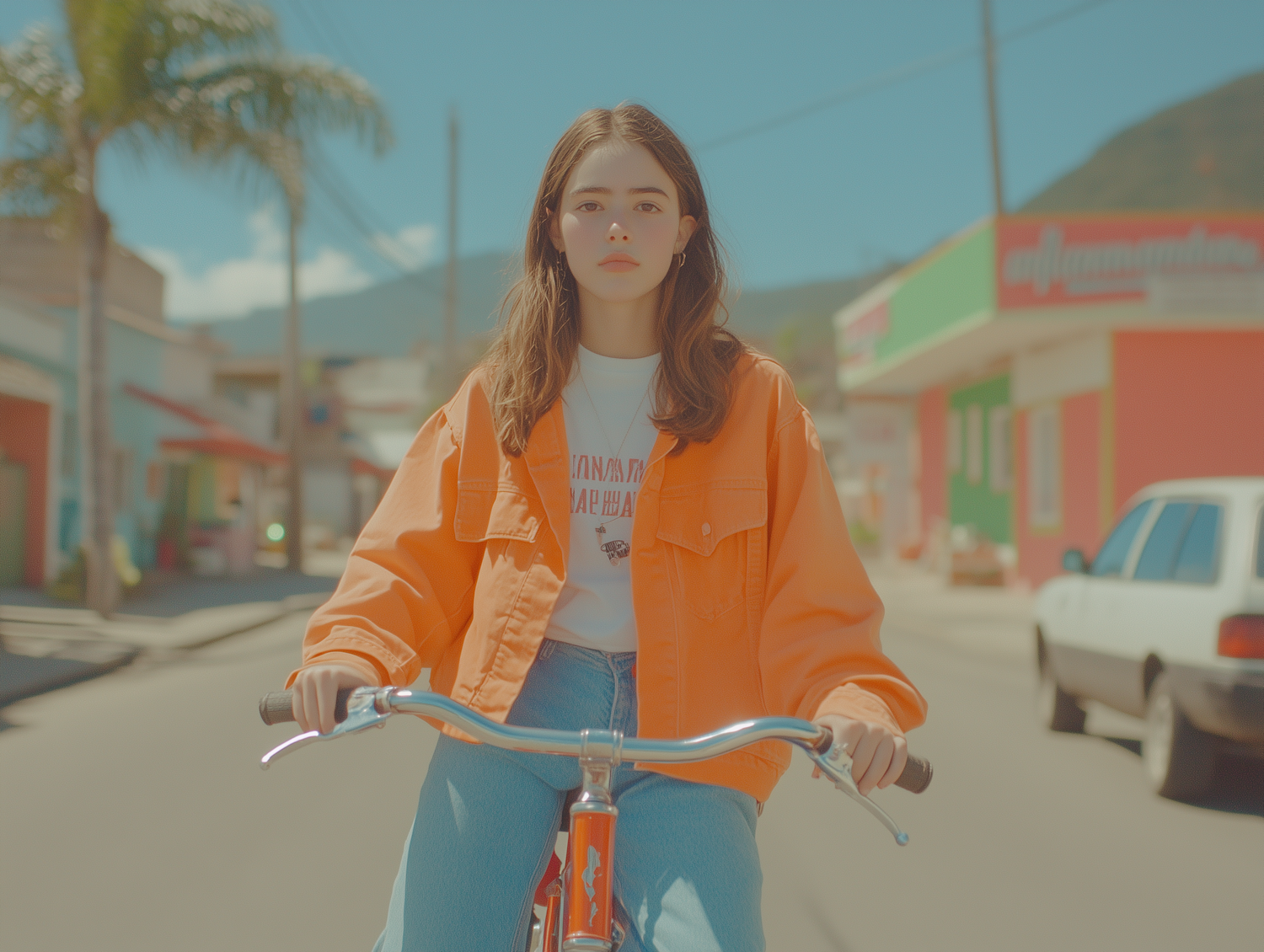 Young woman in orange jacket riding a bicycle on a sunny street with colorful buildings and clear blue sky.