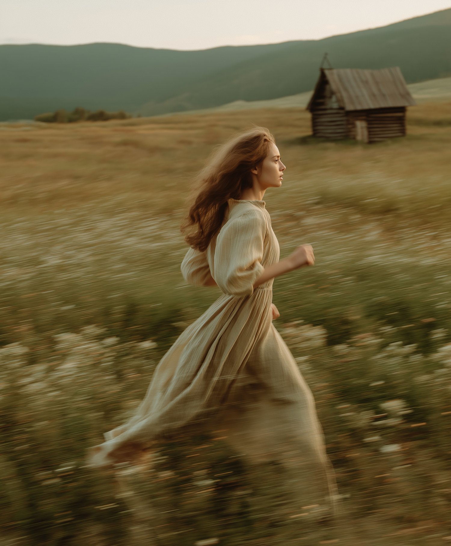 A woman in a flowing beige dress runs through a wildflower field at sunset, with a rustic cabin and rolling hills in the background.