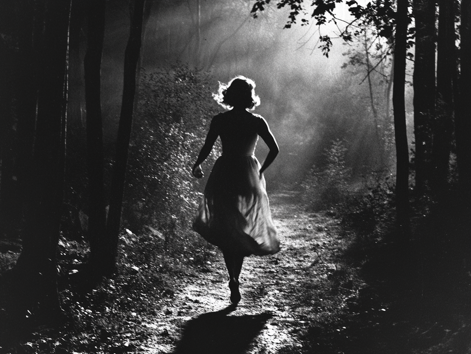 Dramatic black and white scene of a woman running through a shadowy forest, illuminated by striking backlight.