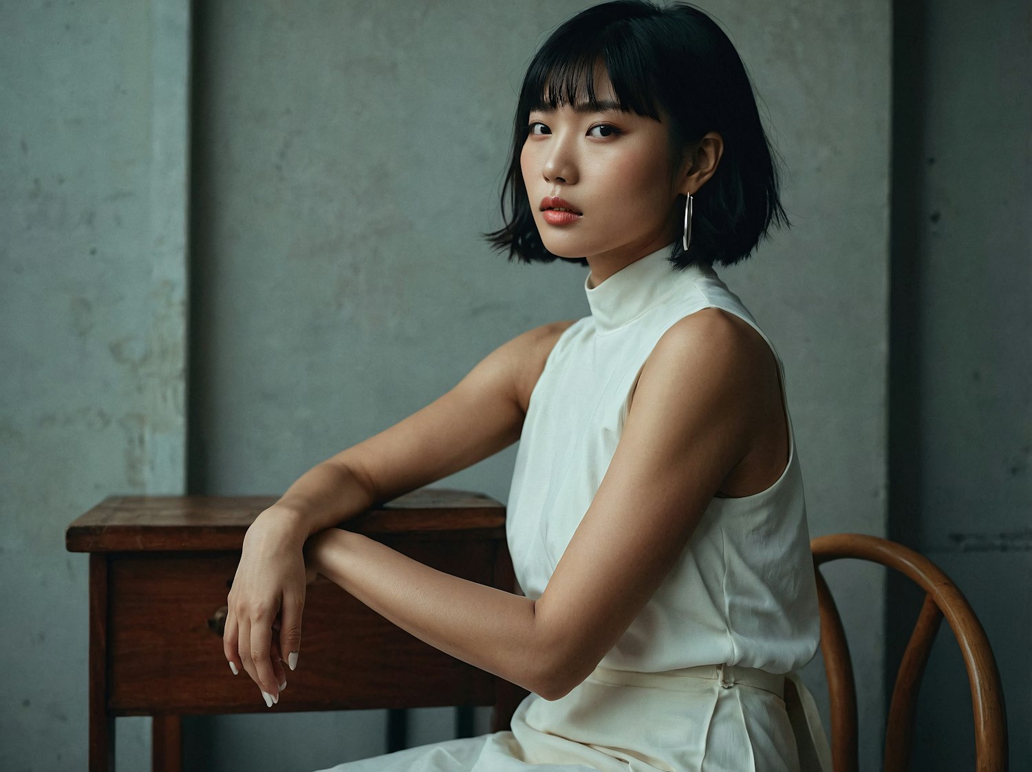 Elegant Asian woman in a white dress with a sleek bob hairstyle, sitting gracefully on a wooden chair against a muted gray background.