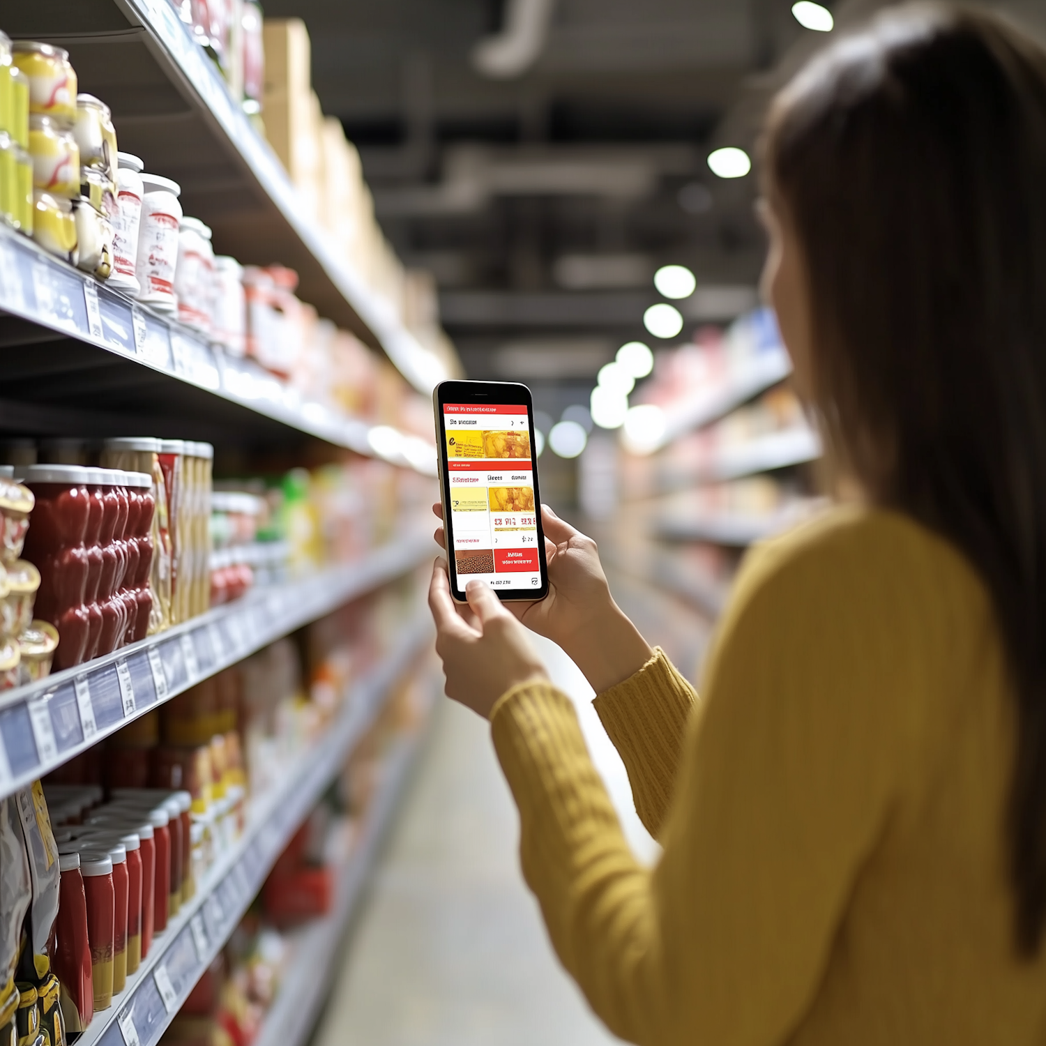 Woman in a grocery store aisle using a smartphone app to browse discounts or shop. Shelves stocked with jars and bottles in the background.