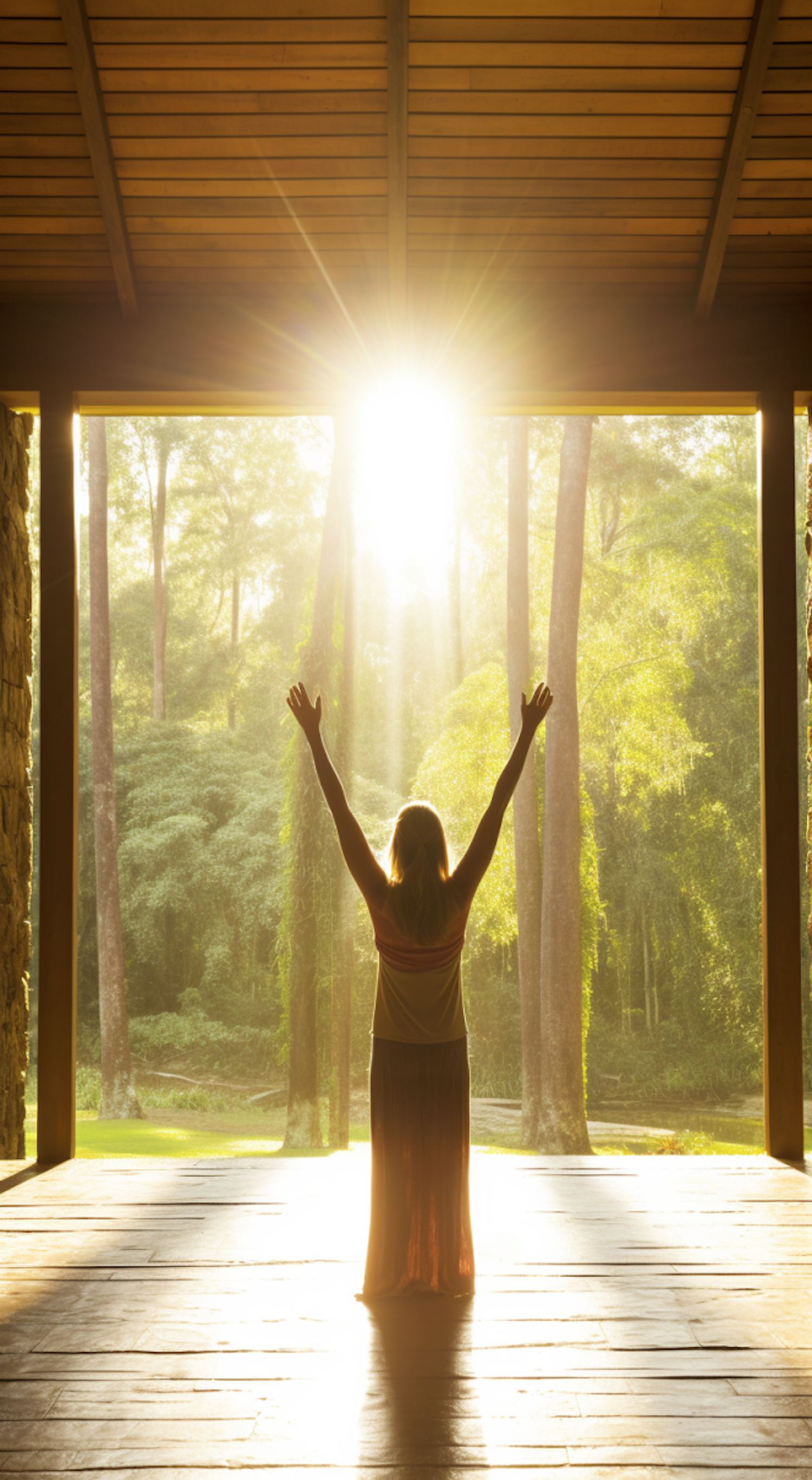 Woman in flowing dress raises arms to sunlight in serene wooden structure surrounded by lush forest, evoking peace and spirituality.