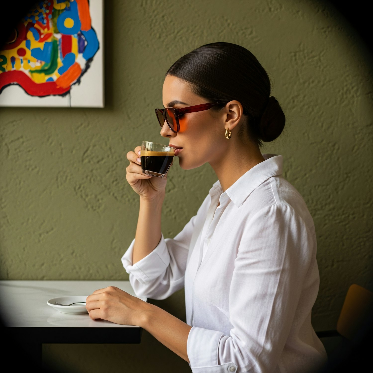 Stylish woman in sunglasses sipping espresso at a cafe, with a green wall and abstract art in the background.