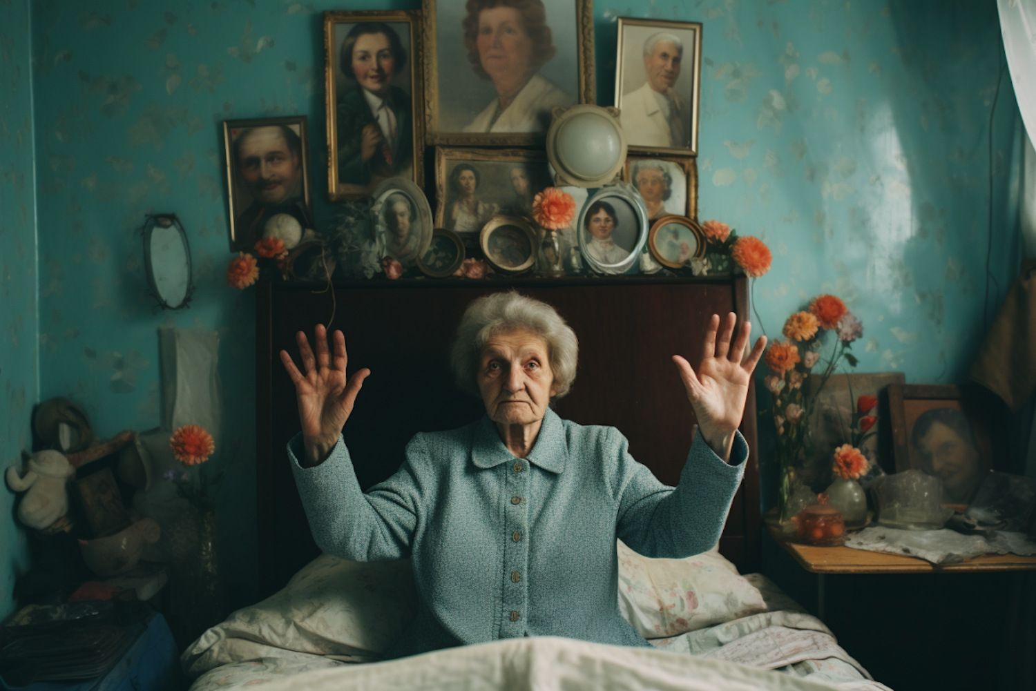 Elderly woman in a teal room, surrounded by family portraits, raises hands in a serene pose. Soft lighting and floral decor add warmth.