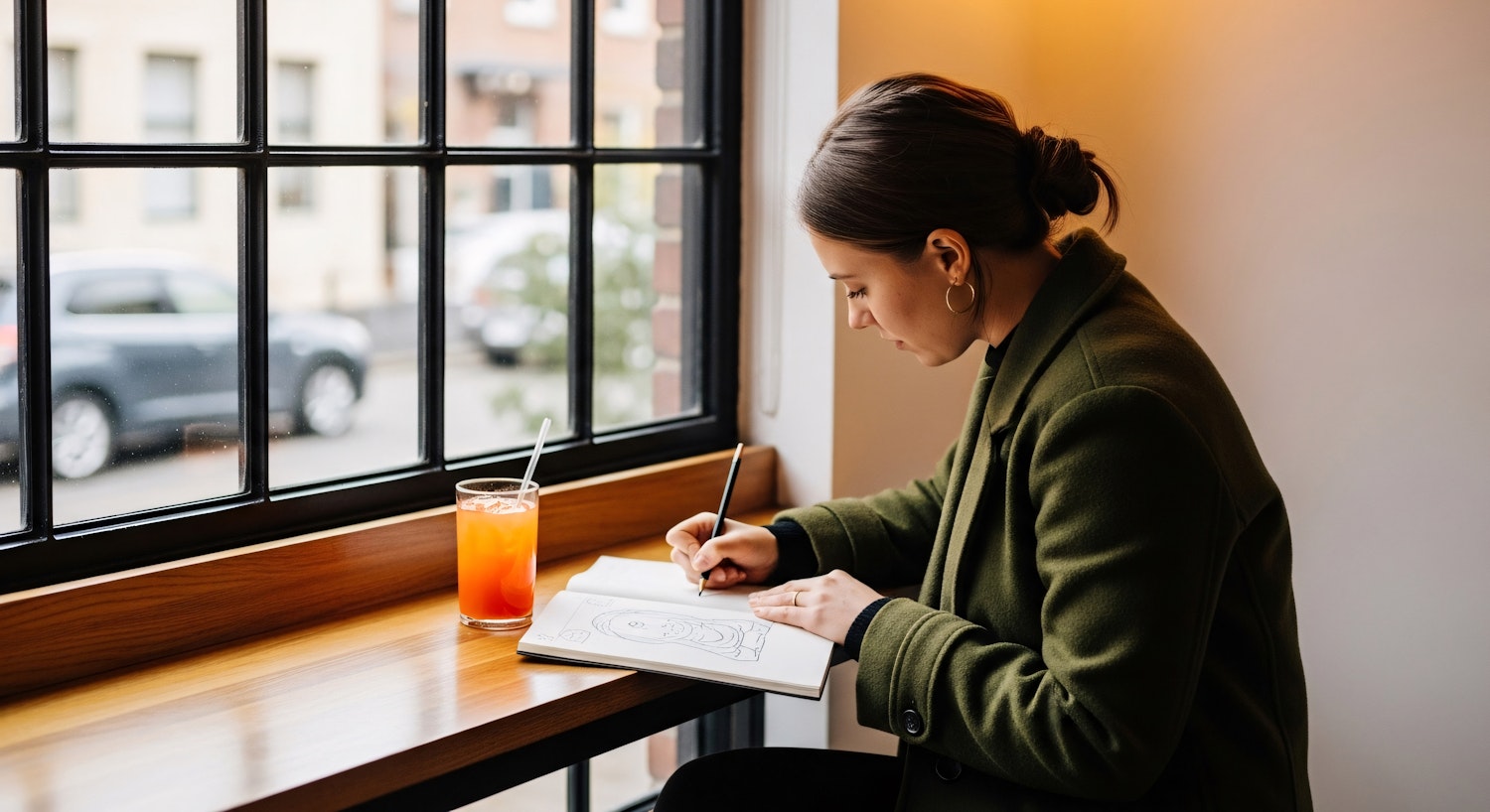 A woman sketches in a notebook by a window, with a glass of orange juice nearby, in a cozy and well-lit setting.
