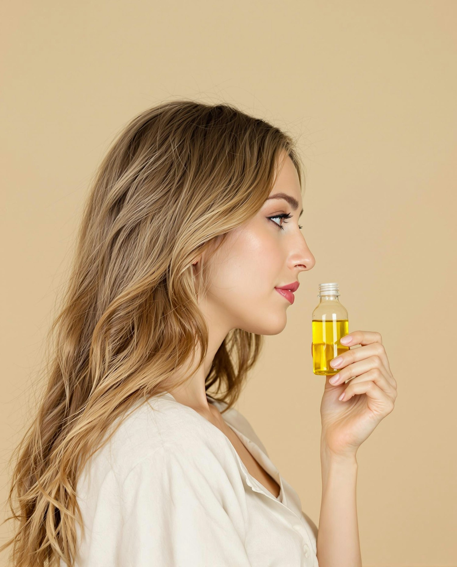 A young woman with long, wavy hair holding a small transparent glass bottle filled with yellow oil, side profile, soft beige background, minimalistic beauty campaign, warm natural lighting, focus on hair and bottle