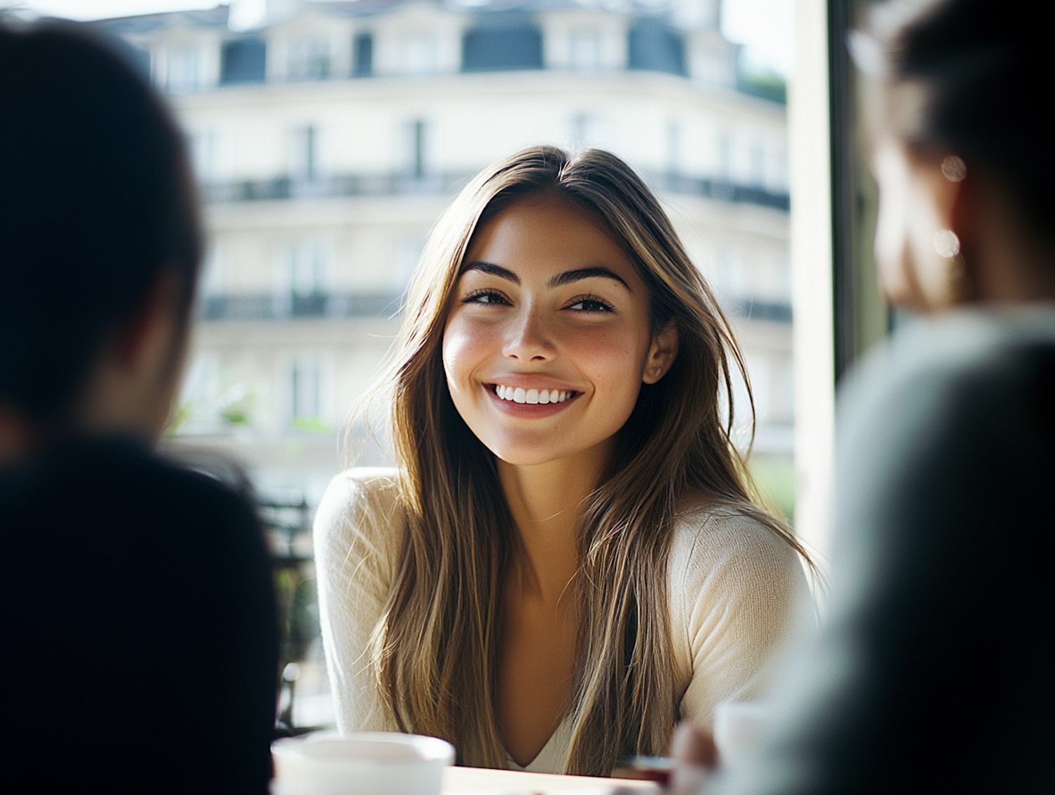 Smiling woman with long hair enjoying a conversation in a cozy urban cafe setting.