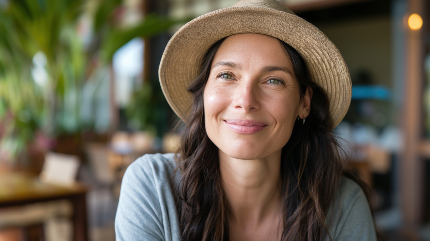 Smiling woman in a straw hat with long dark hair and light green eyes, set against a blurred natural background.