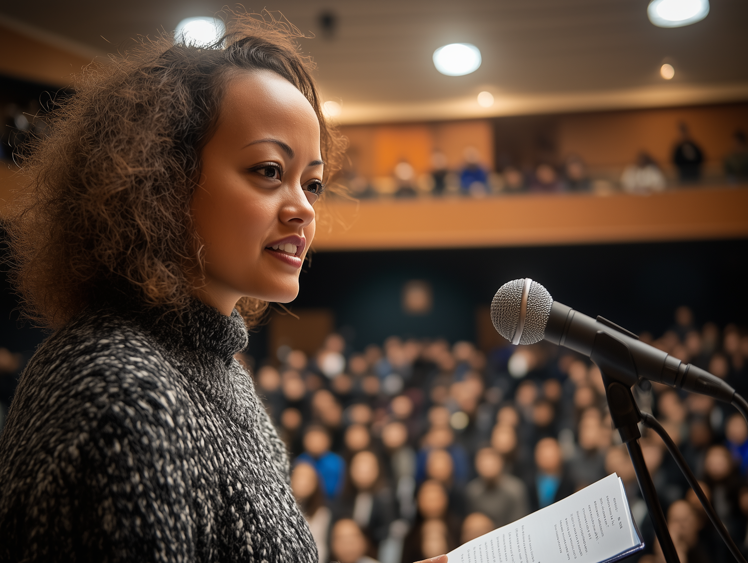 Confident woman with curly hair speaks at a podium, holding a booklet, addressing a large audience in a warmly lit auditorium.