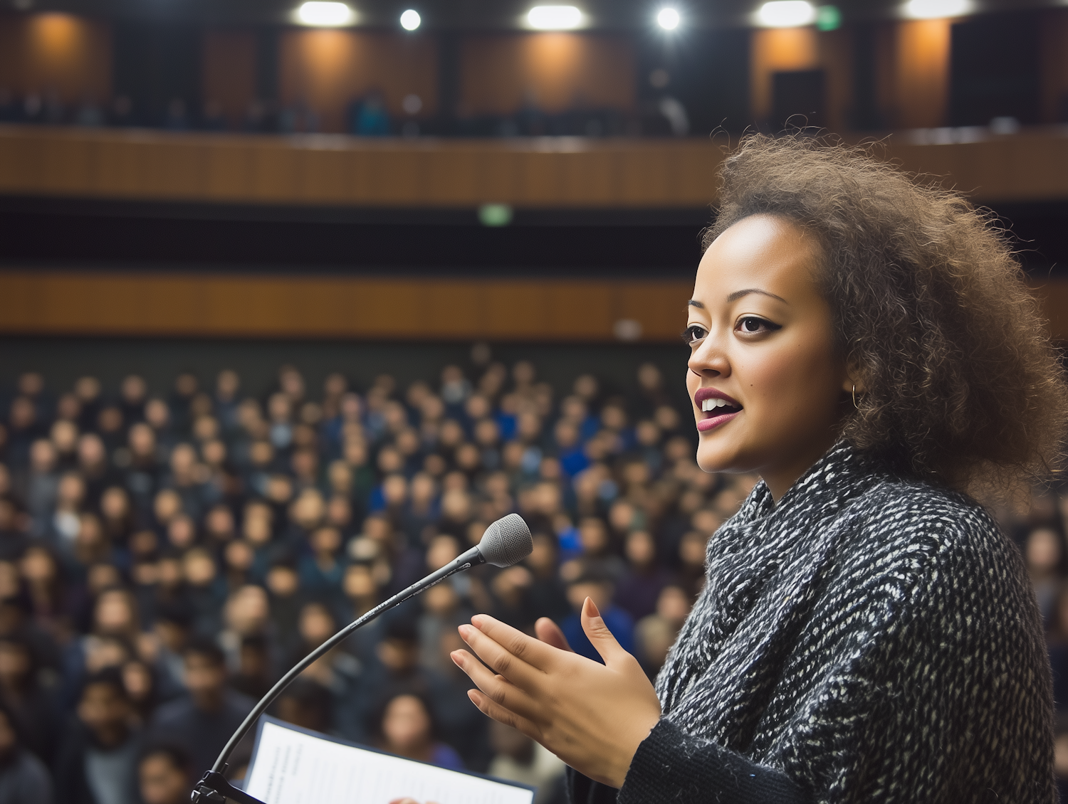 Confident woman with curly hair speaks passionately at a podium in front of a large audience in a dimly lit auditorium.