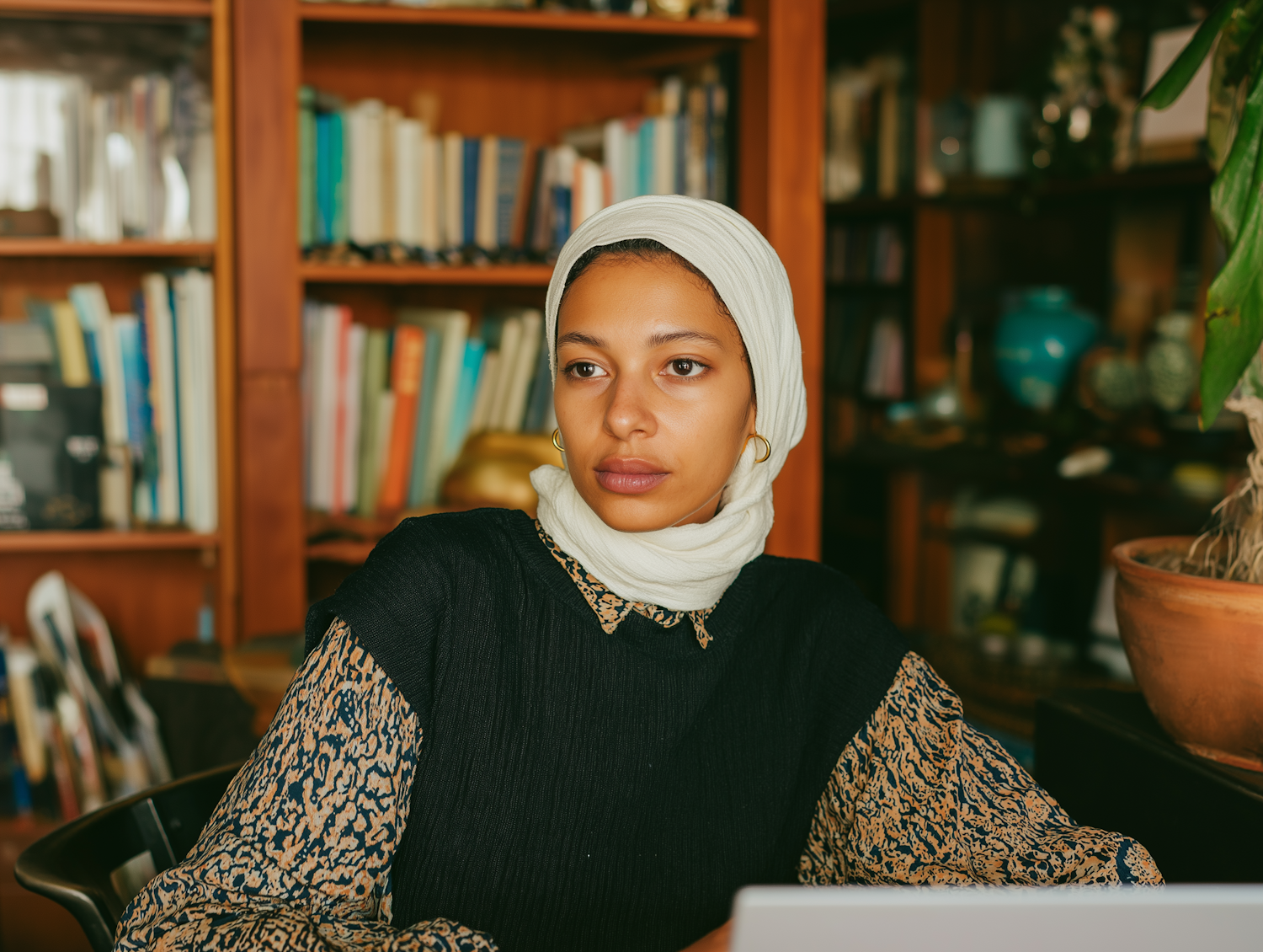 A woman in a white headscarf sits in a cozy library setting, surrounded by books and a potted plant, appearing focused and thoughtful.