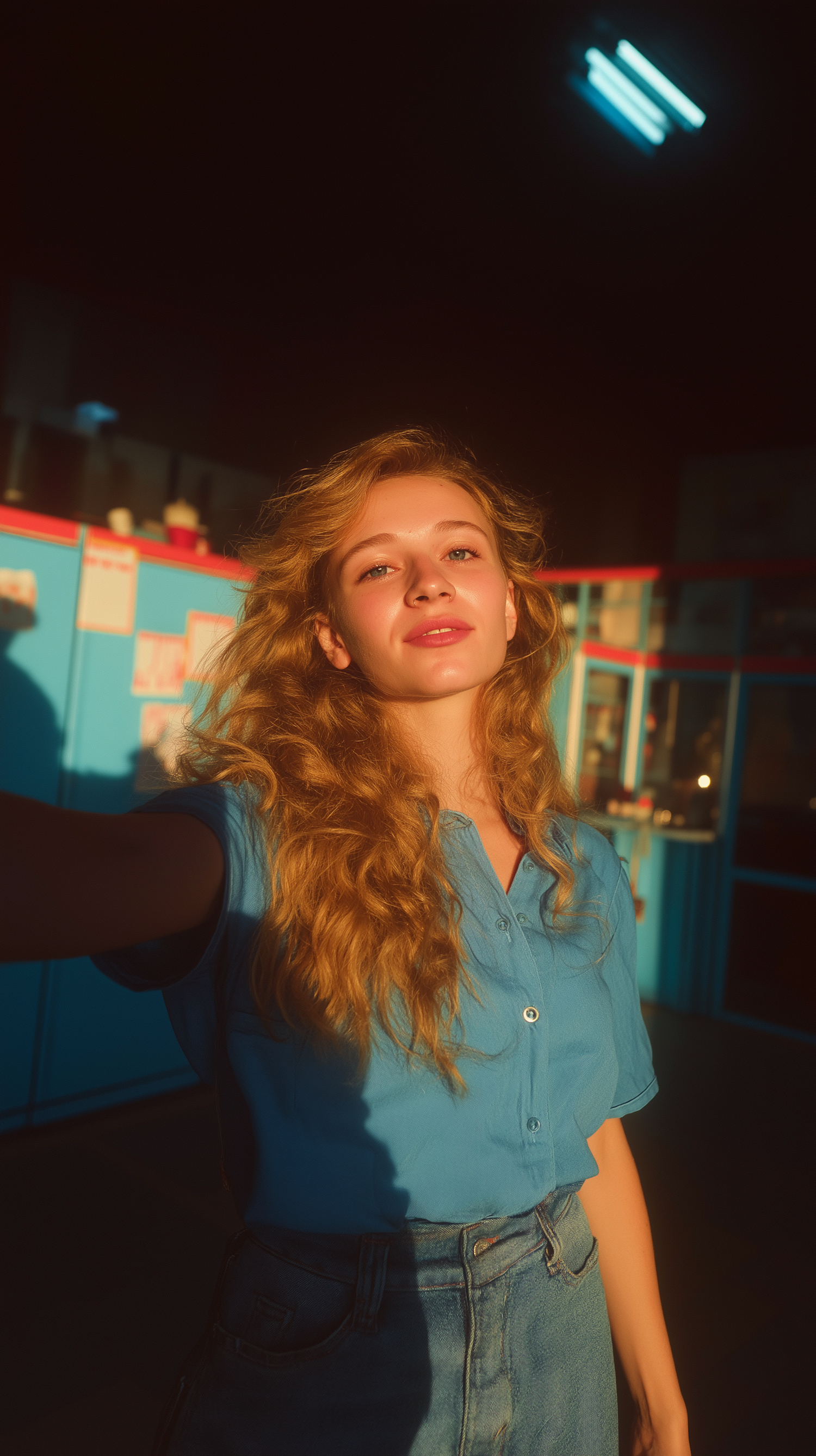A young woman with wavy blonde hair takes a selfie in warm lighting, wearing a blue shirt and jeans, with a colorful interior in the background.