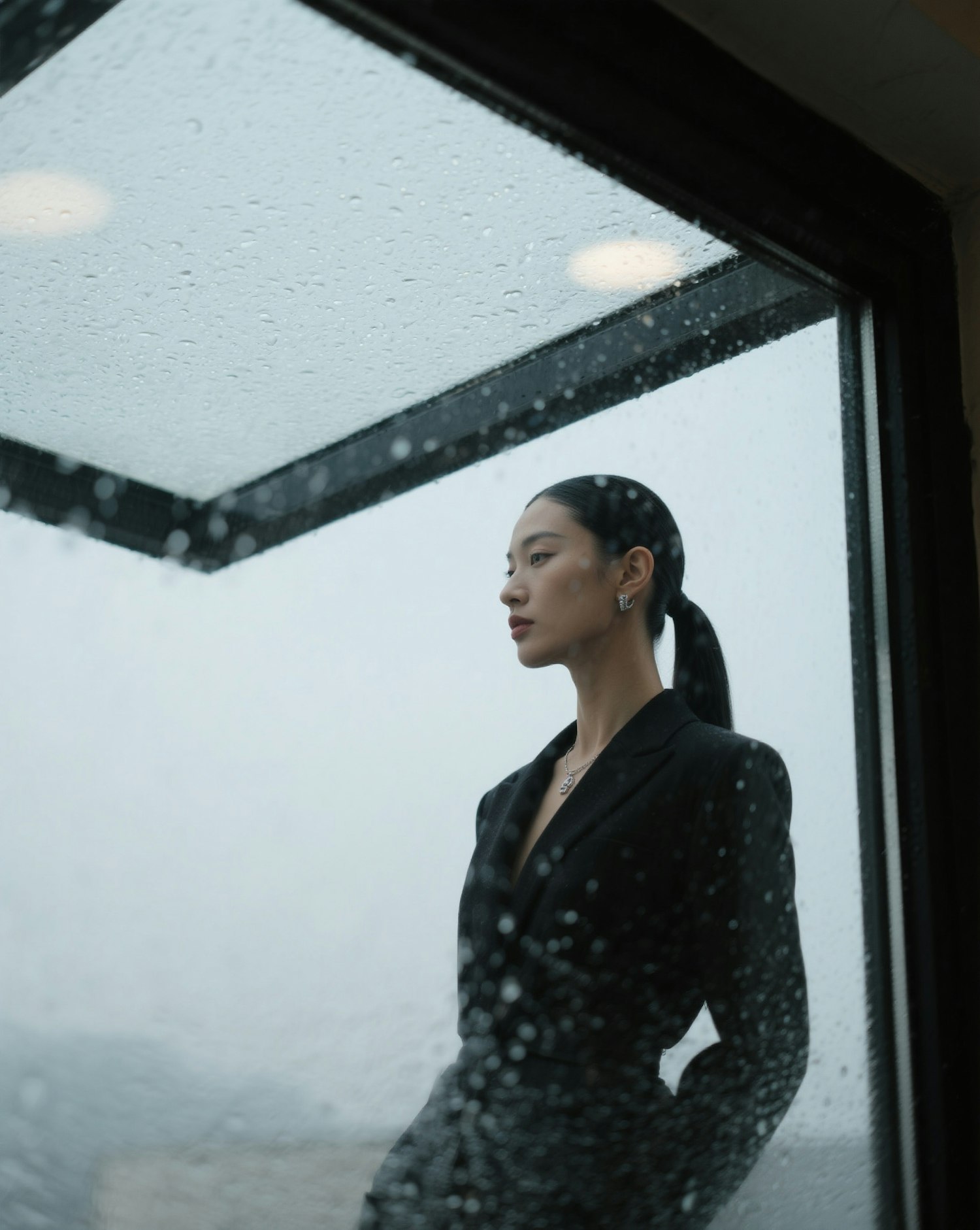 A woman in a black blazer gazes through a rain-speckled window, creating a serene and reflective mood against a gray sky.