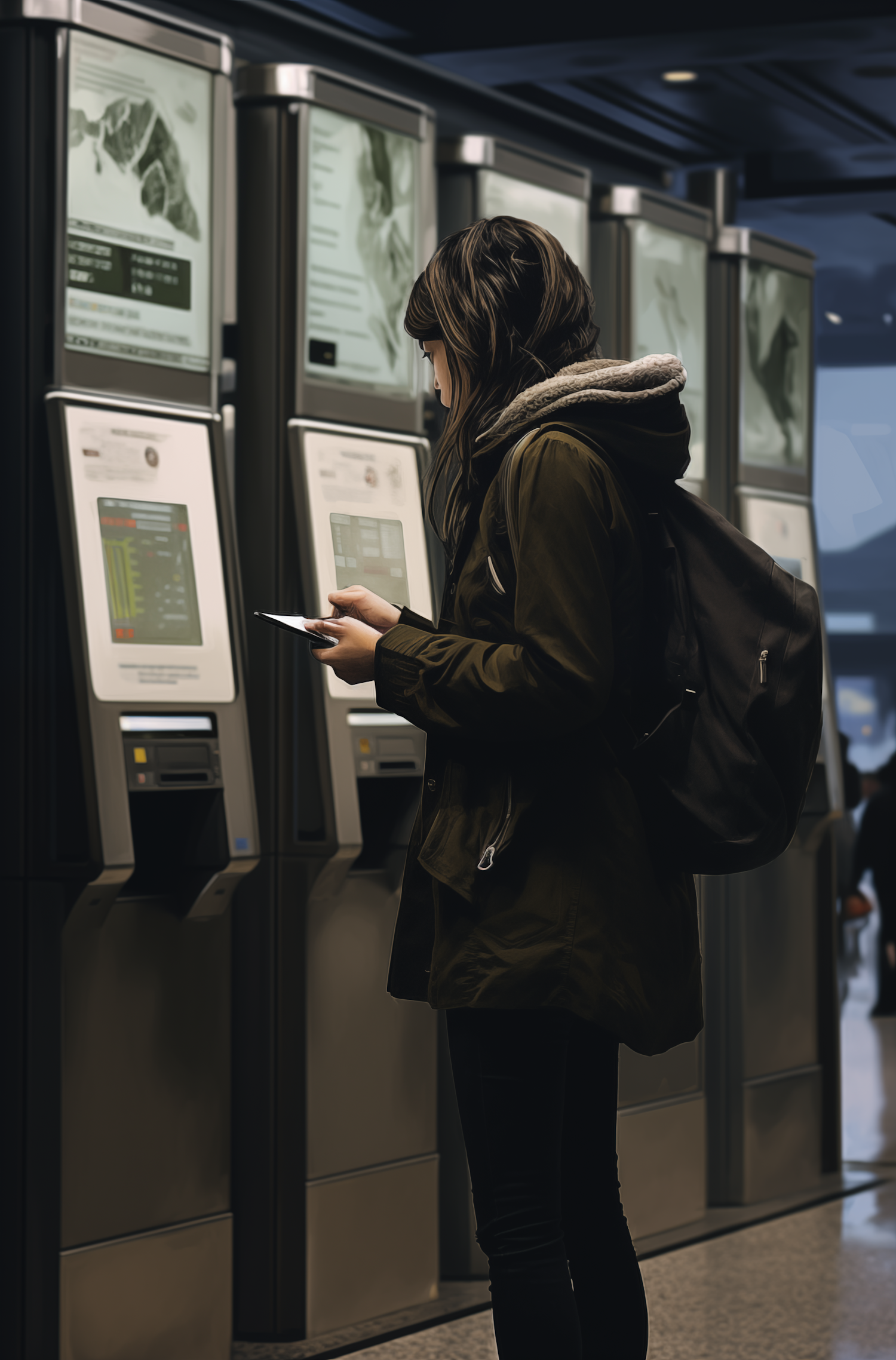 Woman Using Electronic Ticketing Kiosk at Transit Station