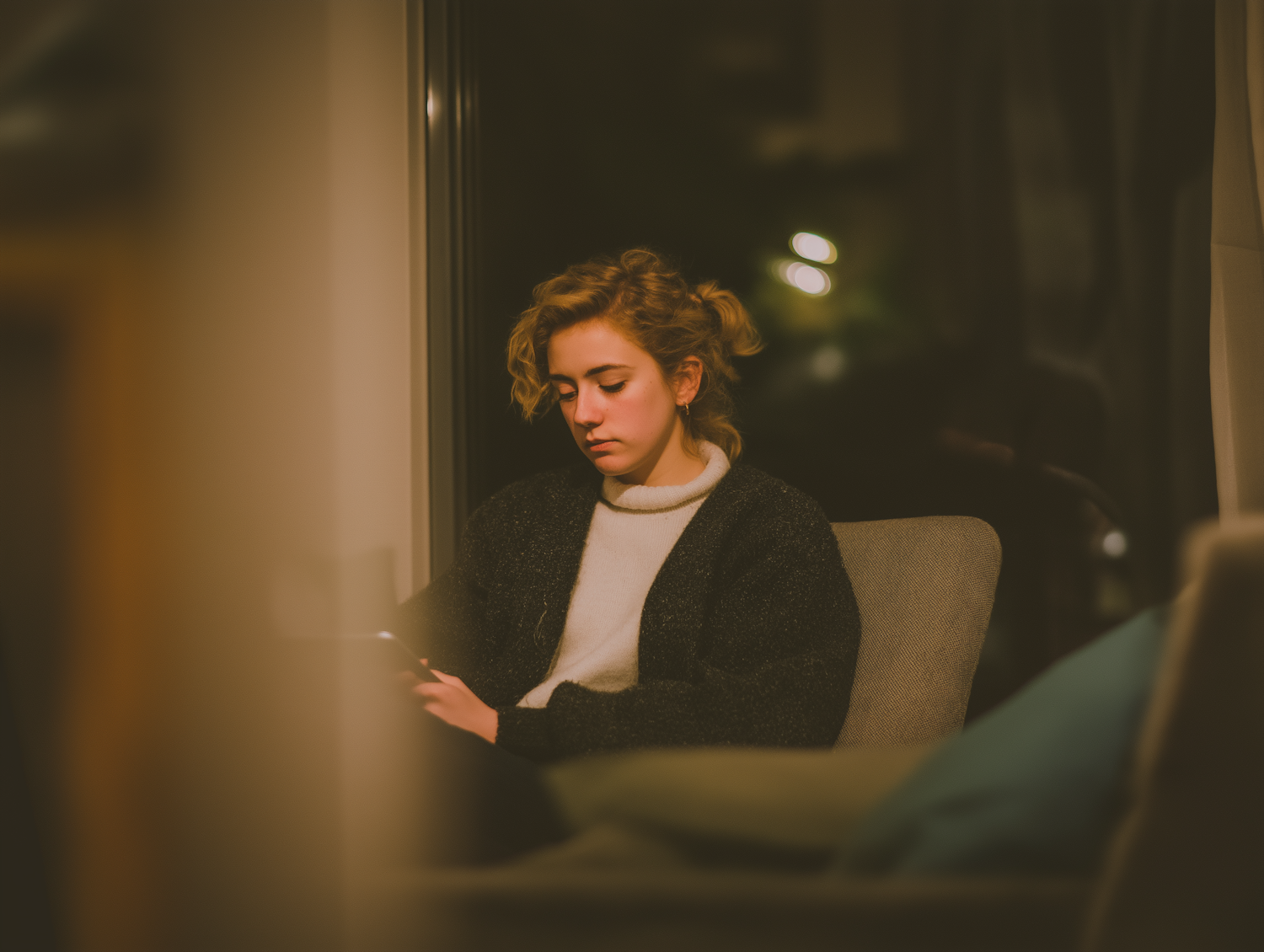 A young woman sits indoors, focused on her phone, in a warmly lit, cozy setting with a blurred background for a serene atmosphere.