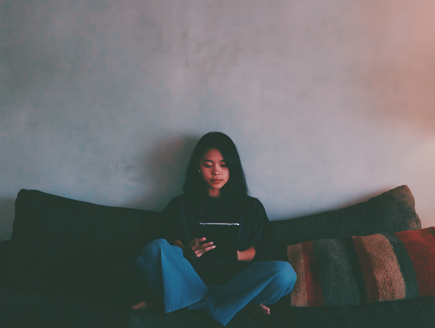 A young woman sits on a couch, focused on her tablet, with warm lighting and a cozy atmosphere.