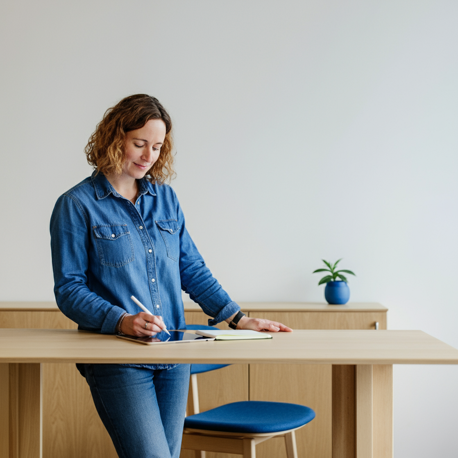 Woman in denim outfit writing on a tablet at a wooden table in a minimalist room with a small plant in the background.