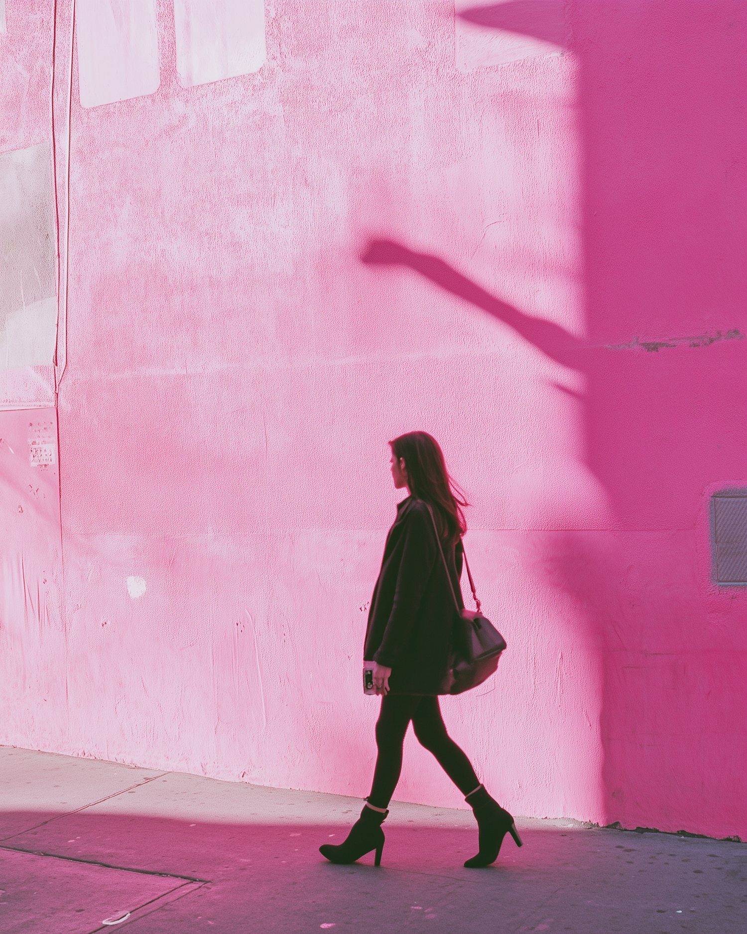Woman in black attire walks past a vibrant pink wall, casting a shadow. Urban fashion meets bold color contrast.