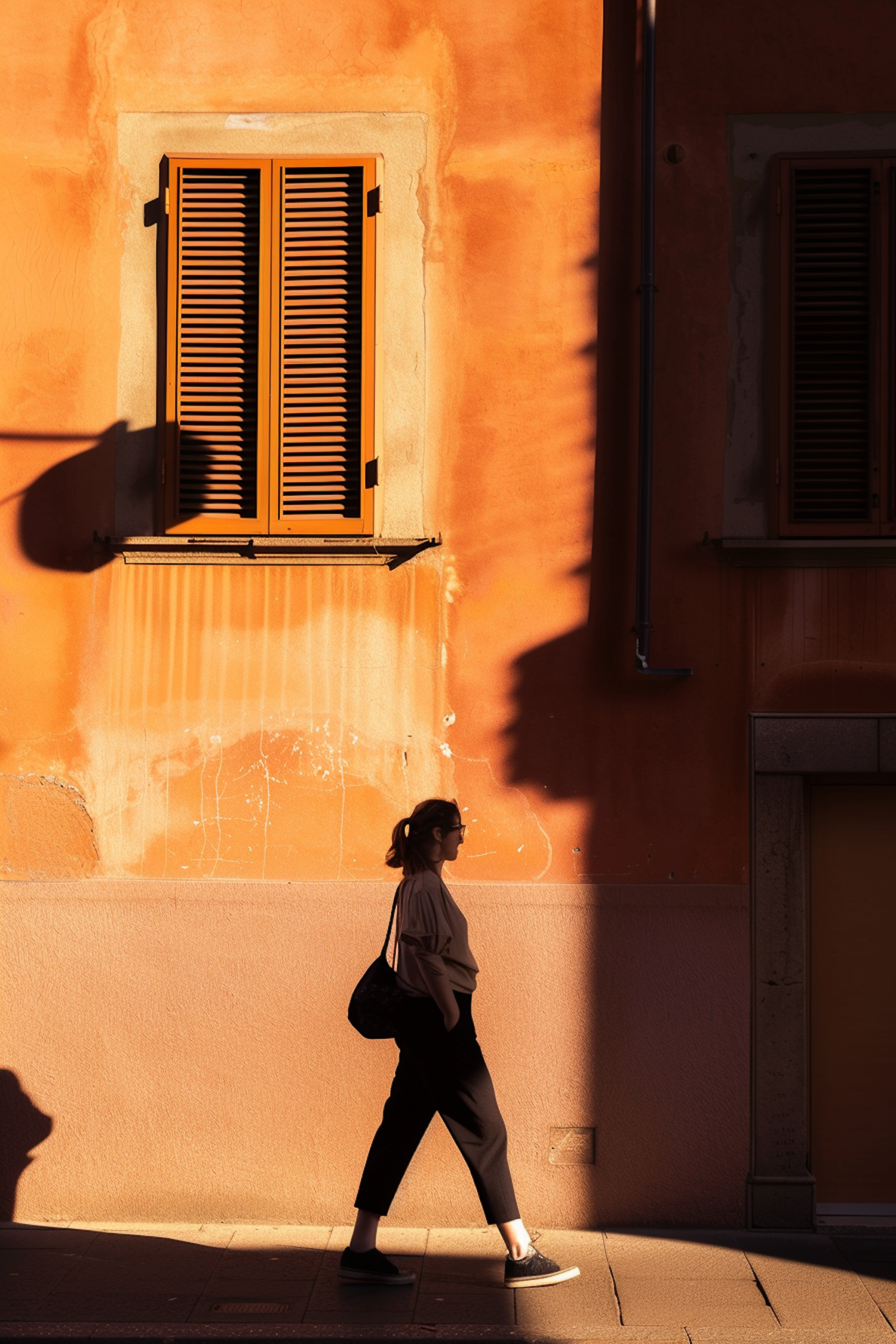 Woman walking by a sunlit terracotta wall with wooden shutters casting shadows. Stylish urban scene with strong light contrasts.