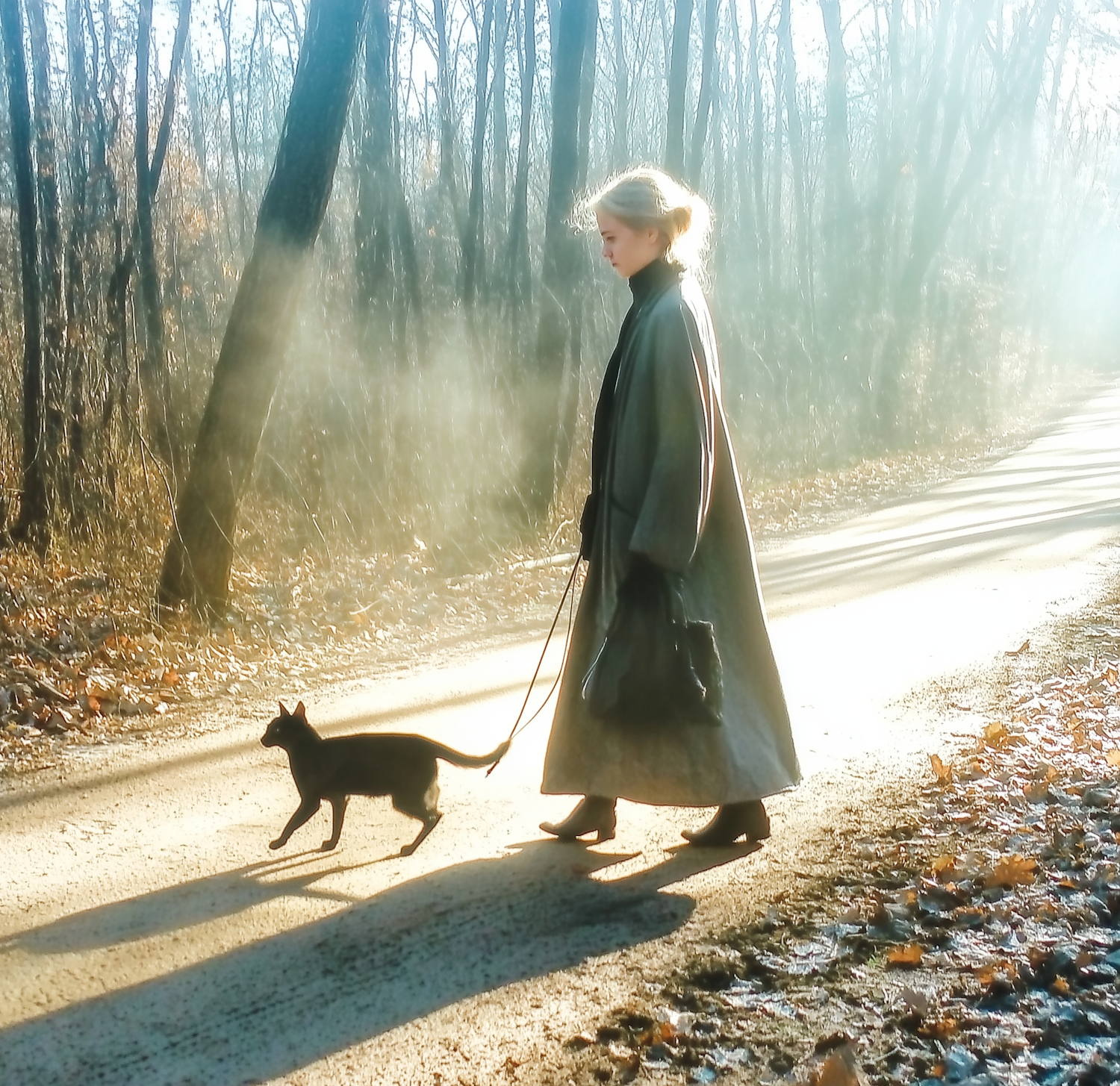 Woman in a long coat walking a black dog on a sunlit forest path, surrounded by bare trees and autumn leaves.