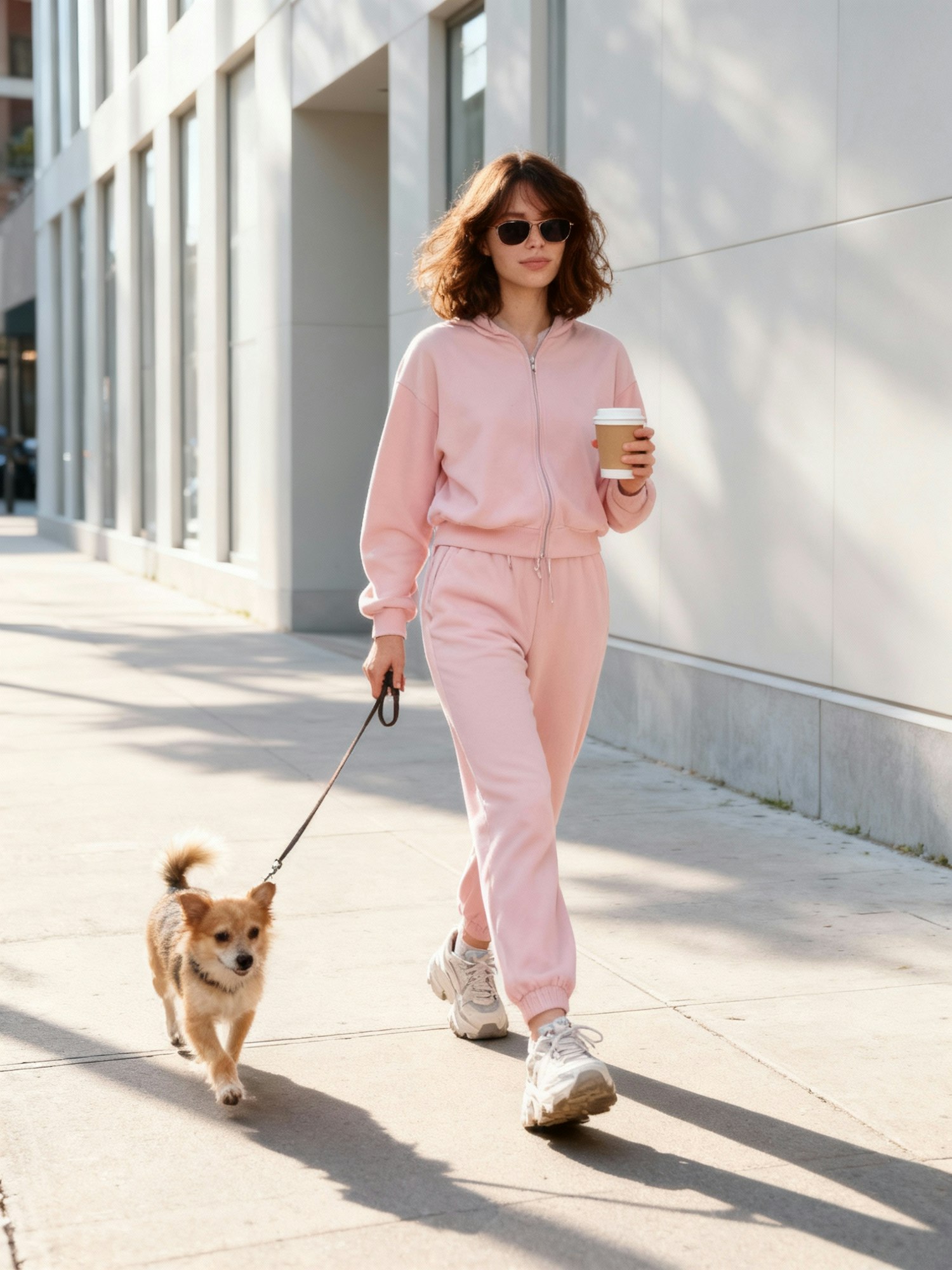 A woman in a pink tracksuit walks her small dog on a sunny sidewalk, holding a coffee cup. The scene is bright and casual.