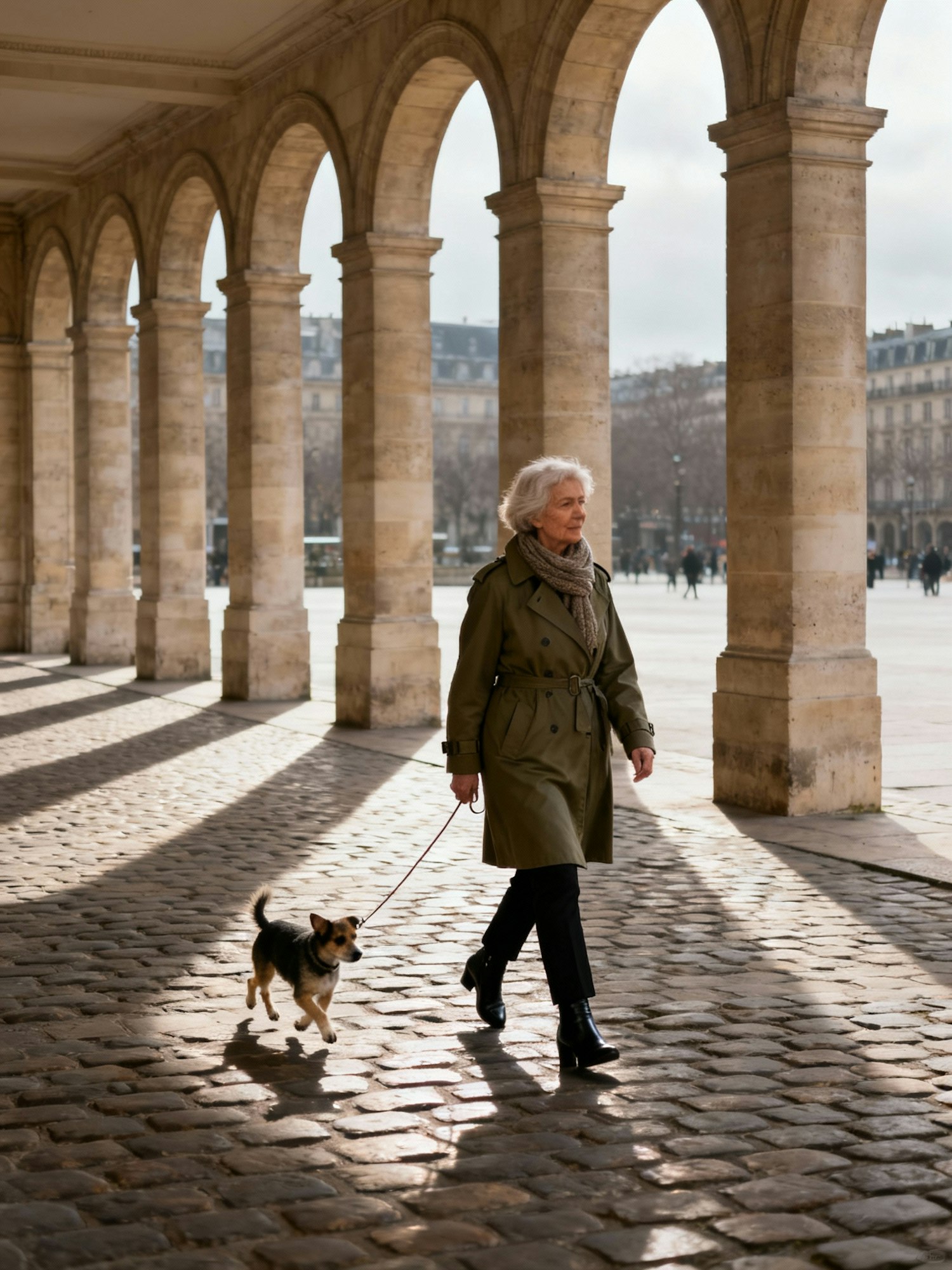 A woman walks her small dog under stone arches on a cobblestone path, with soft light and a cityscape in the background.
