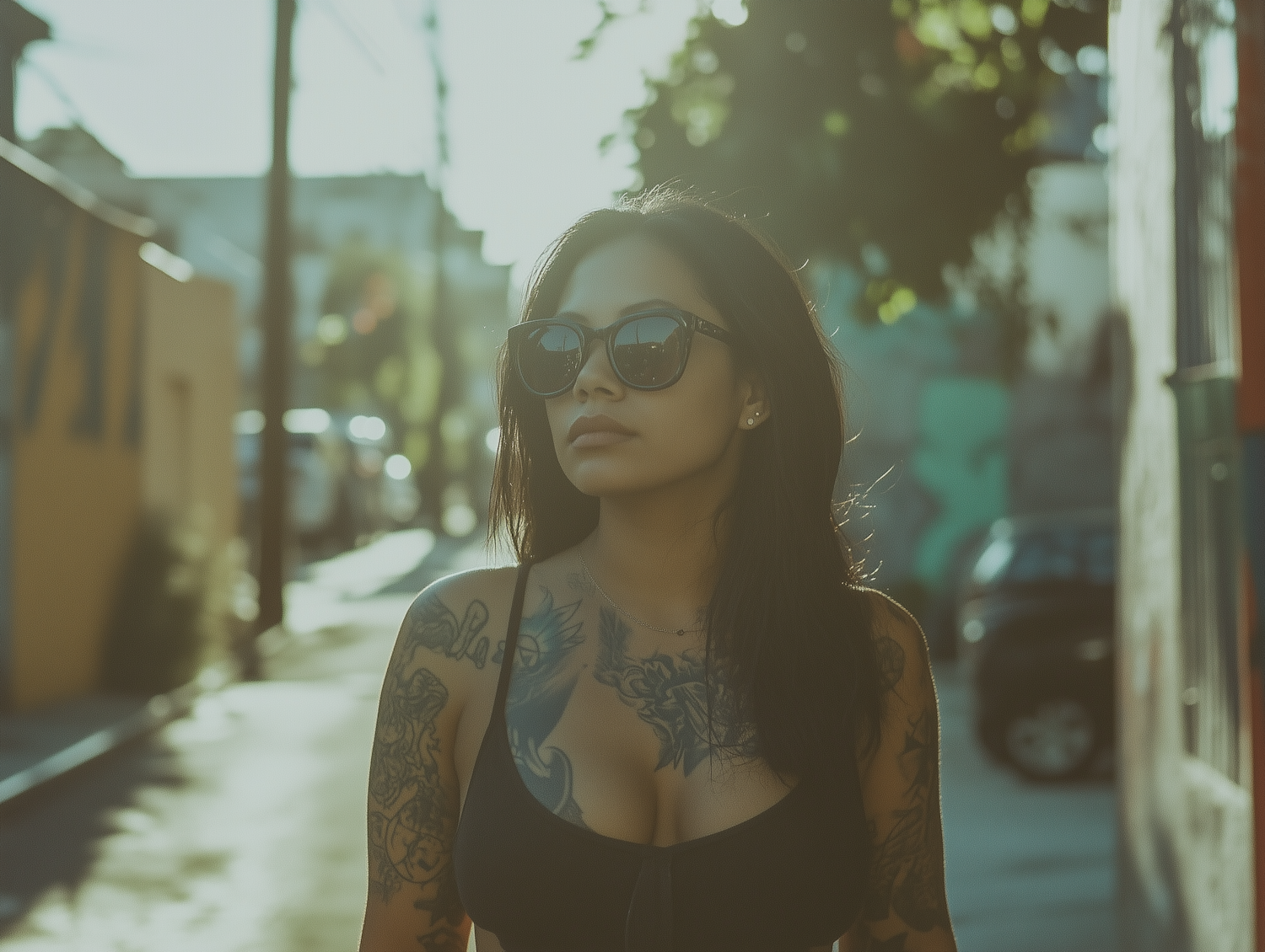 Stylish woman with tattoos and sunglasses in a sunlit urban setting, exuding confidence and a relaxed vibe.