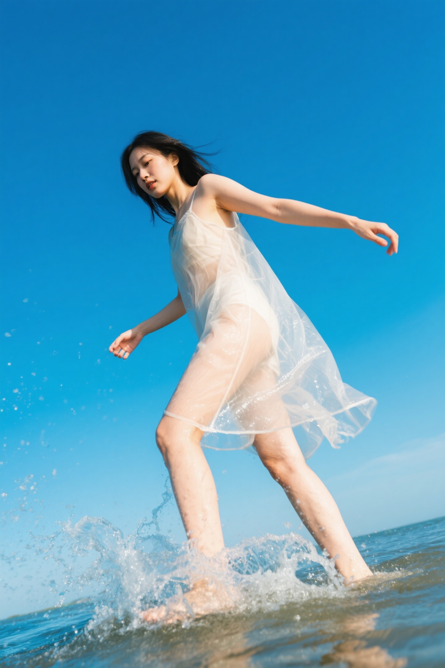 A woman in a sheer dress over a swimsuit walks through splashing water under a bright blue sky, capturing a carefree summer vibe.