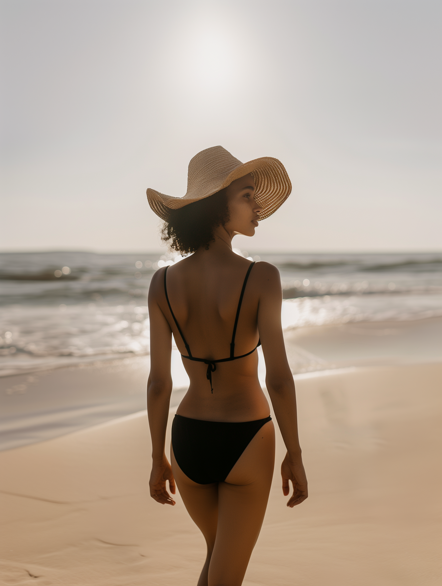 Woman in a black bikini and straw hat walking on a sunlit beach, with gentle waves and a warm glow in the background.