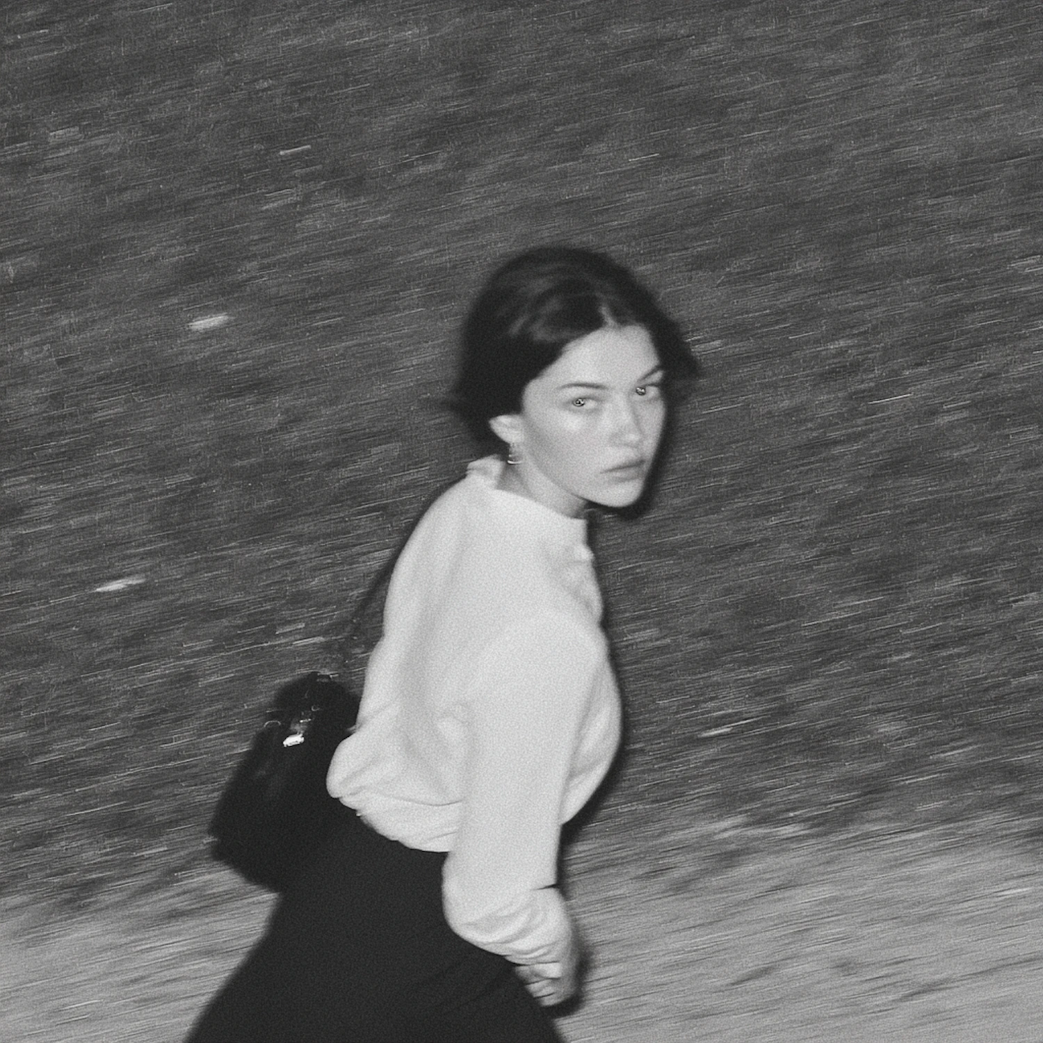 Black-and-white photo of a woman walking outdoors, wearing a white blouse and dark trousers, looking back over her shoulder.