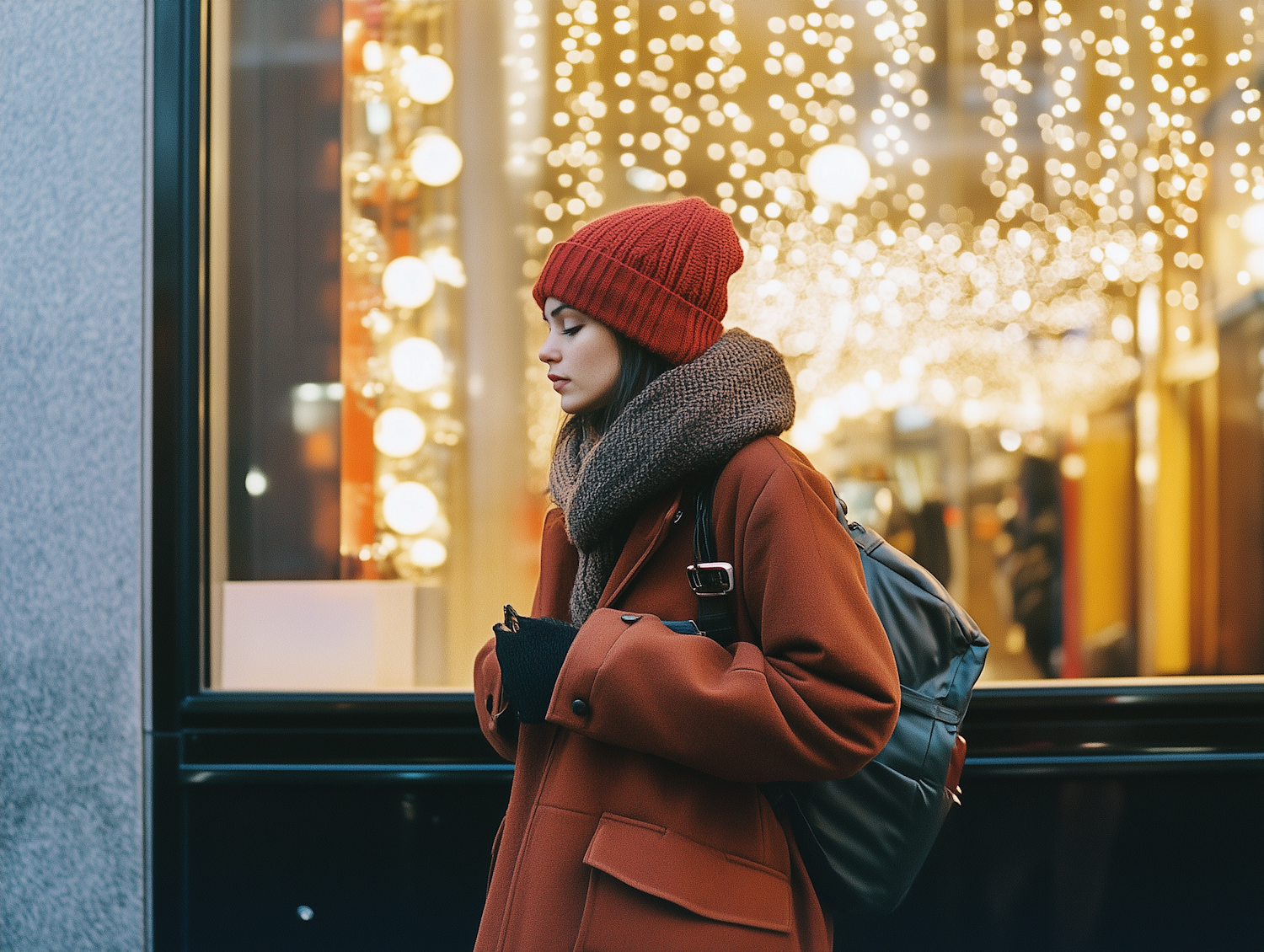 Person in a rust coat and red beanie stands by a festive, light-filled window display, creating a cozy winter atmosphere.