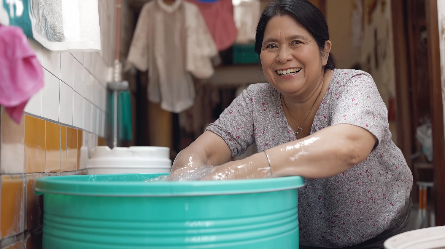 Smiling woman washing clothes in a turquoise basin, surrounded by hanging laundry in a tiled area.