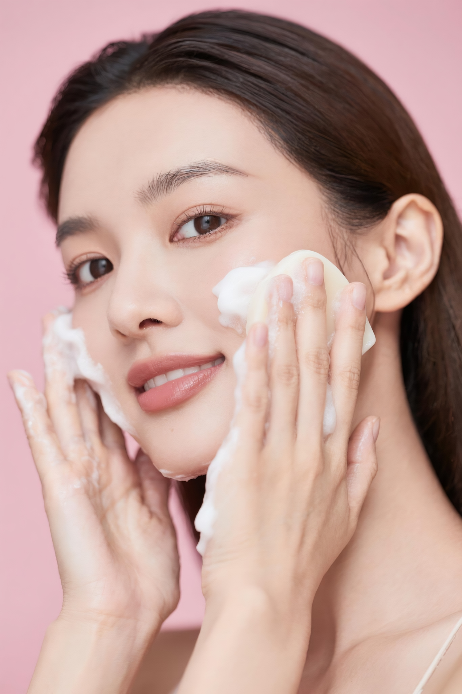 A woman gently washing her face with a foamy cleanser, set against a soft pink background, showcasing a clean and fresh skincare routine.