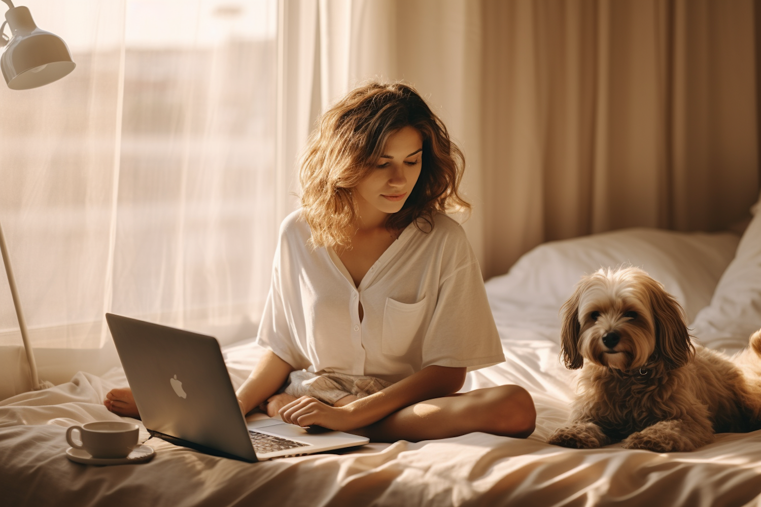 Woman working on a laptop in bed with a fluffy dog, bathed in warm morning light. Cozy and serene atmosphere.
