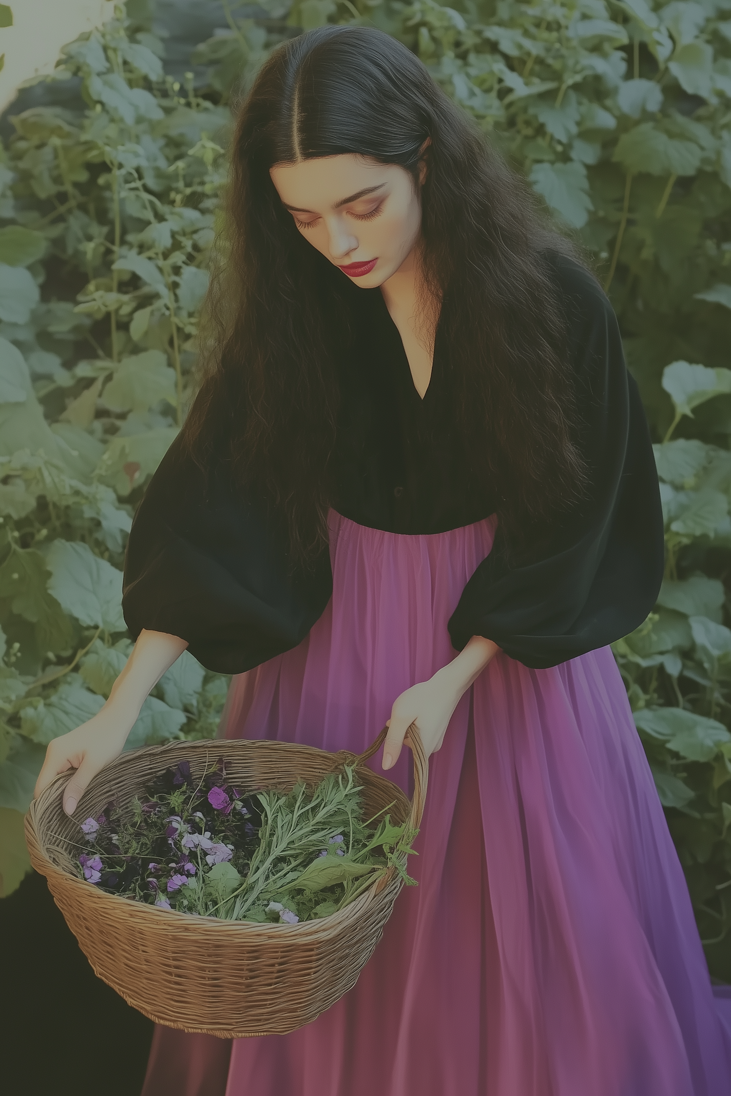 Woman with long dark hair in a black blouse and purple skirt holds a basket of herbs and flowers in a lush garden setting.