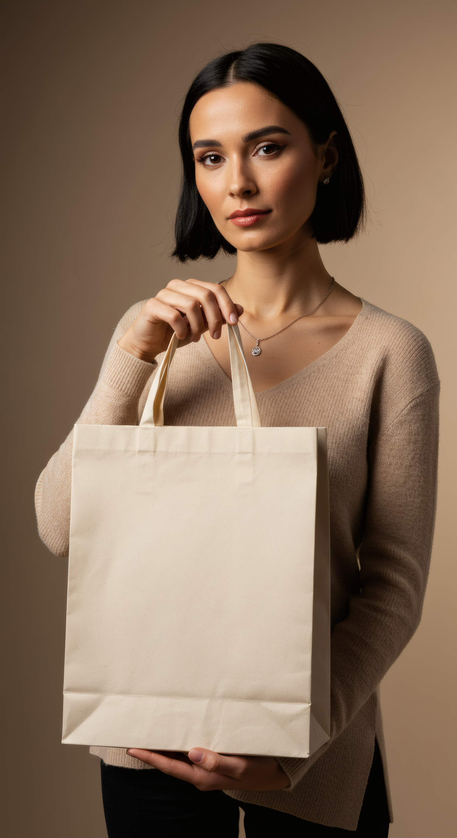 Woman with short black hair holding a beige shopping bag against a warm beige background.